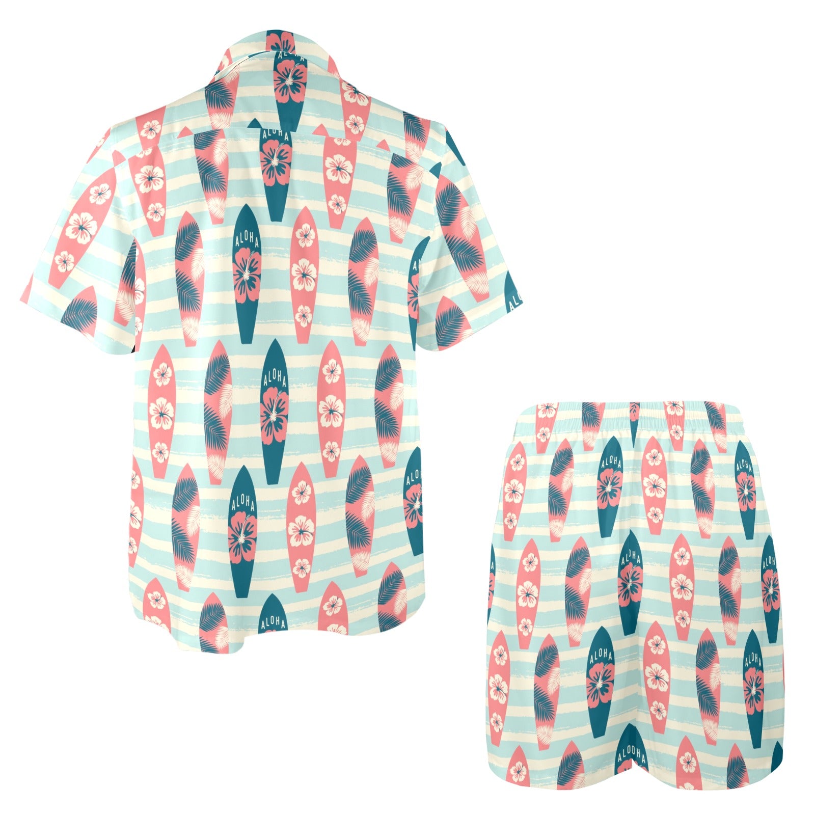 Aloha Hawaii Surfboard Pattern Print Design 02 Men's Beach Shirt and Shorts Set. It is hand-cut and sewn just for your order! This process starts as soon as your order is placed and may have a processing time of 5-9 business days before it ships.