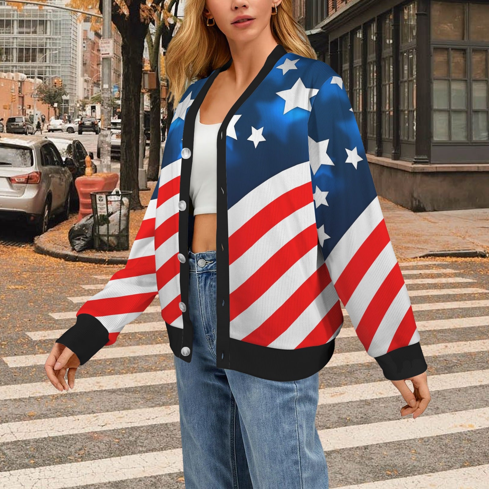 American flag Style Women's Cardigan made-to-order and handcrafted to the highest quality standards.