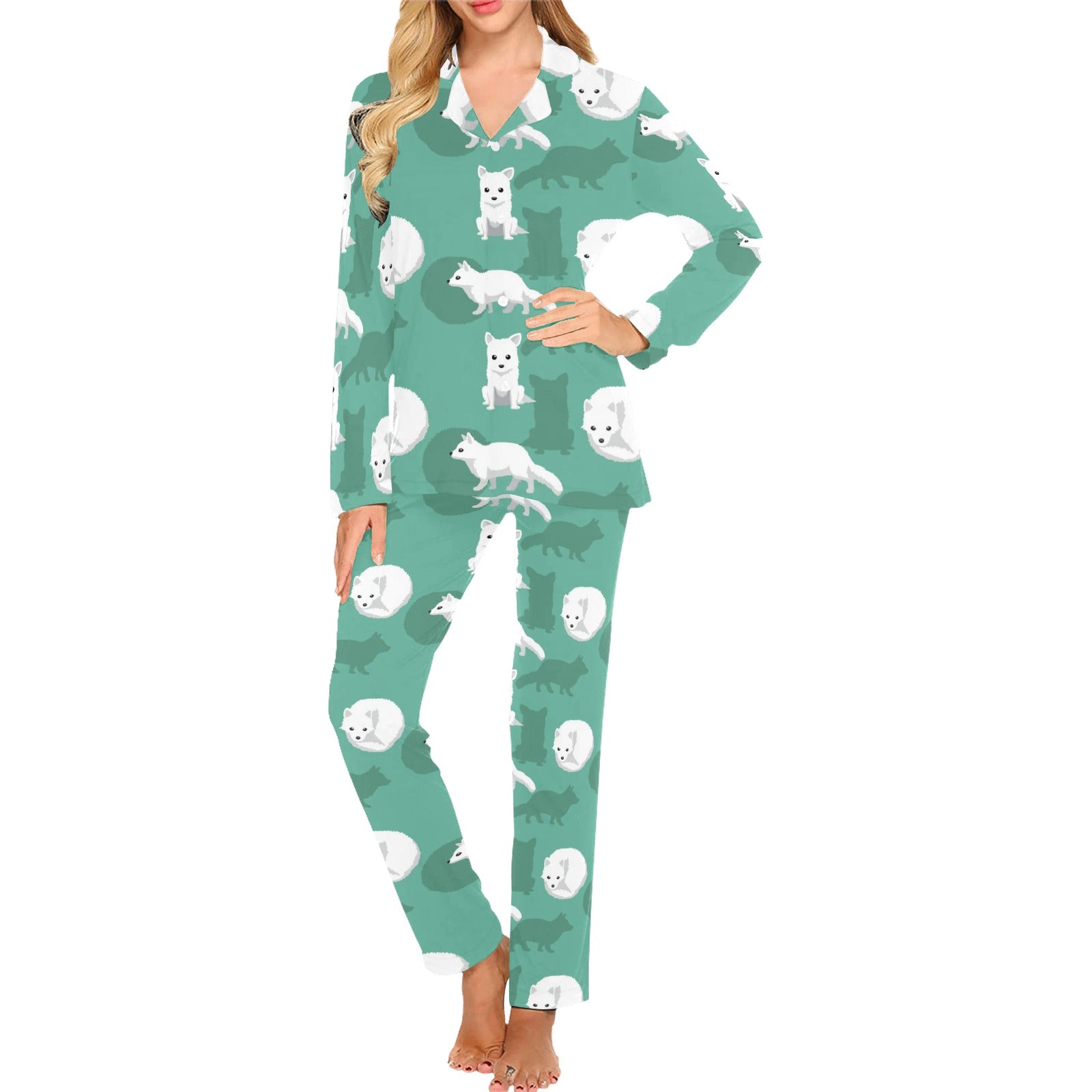 Arctic Fox Pattern Print Design Women's Long Pajama Set Made to Order Item. It is hand-cut and sewn just for your order! This process starts as soon as your order is placed and may have a processing time of 5-9 business days before it ships.