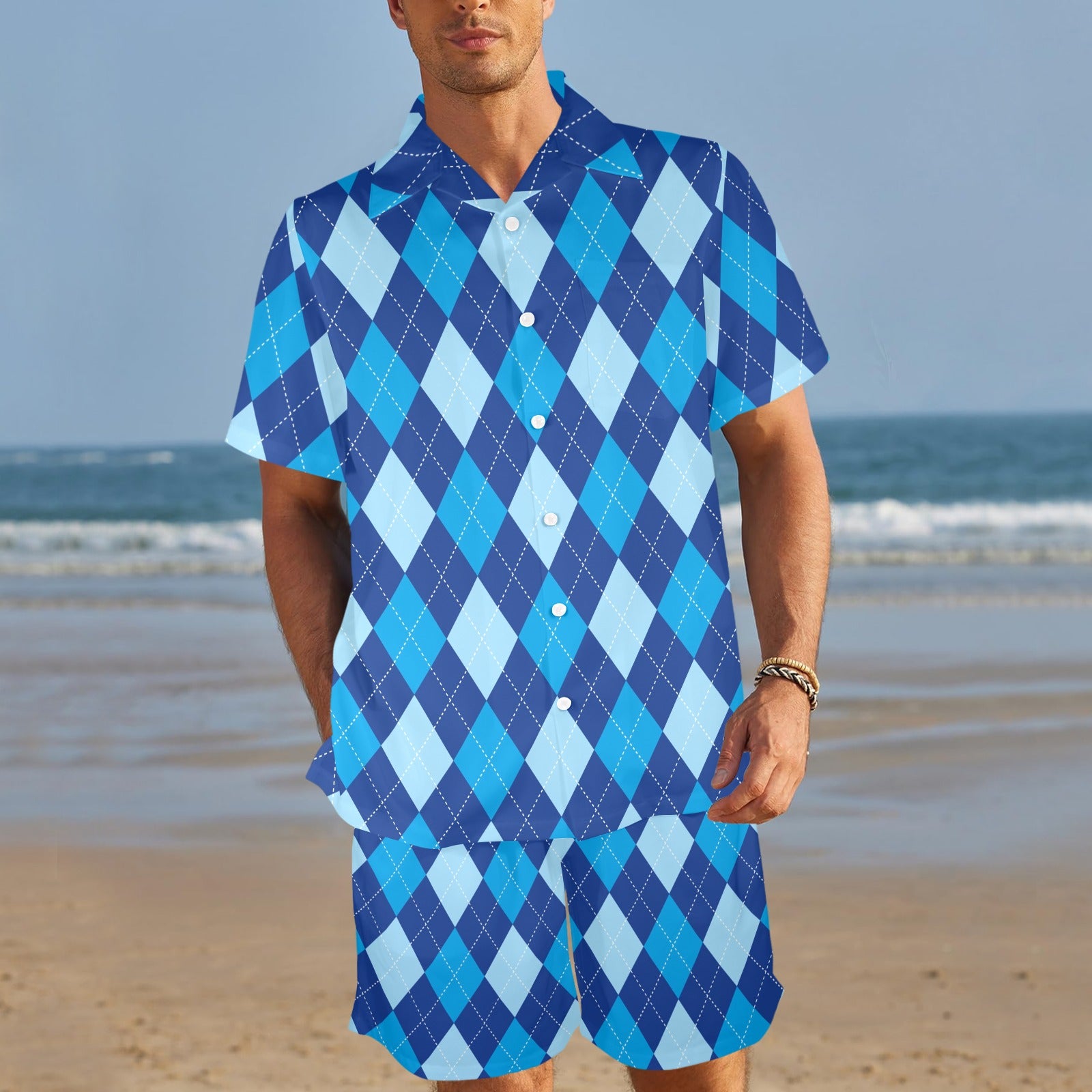 Argyle Blue Pattern Print Design 02 Men's Beach Shirt and Shorts Set. It is hand-cut and sewn just for your order! This process starts as soon as your order is placed and may have a processing time of 5-9 business days before it ships.