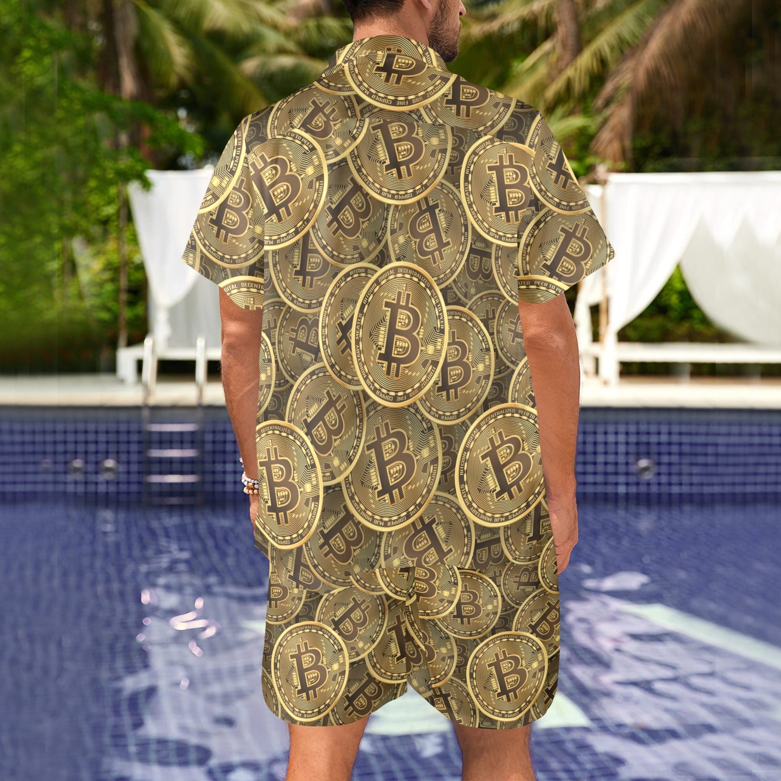 Bitcoin Pattern Print Design DO01 Men's Beach Shirt and Shorts Set. It is hand-cut and sewn just for your order! This process starts as soon as your order is placed and may have a processing time of 5-9 business days before it ships.