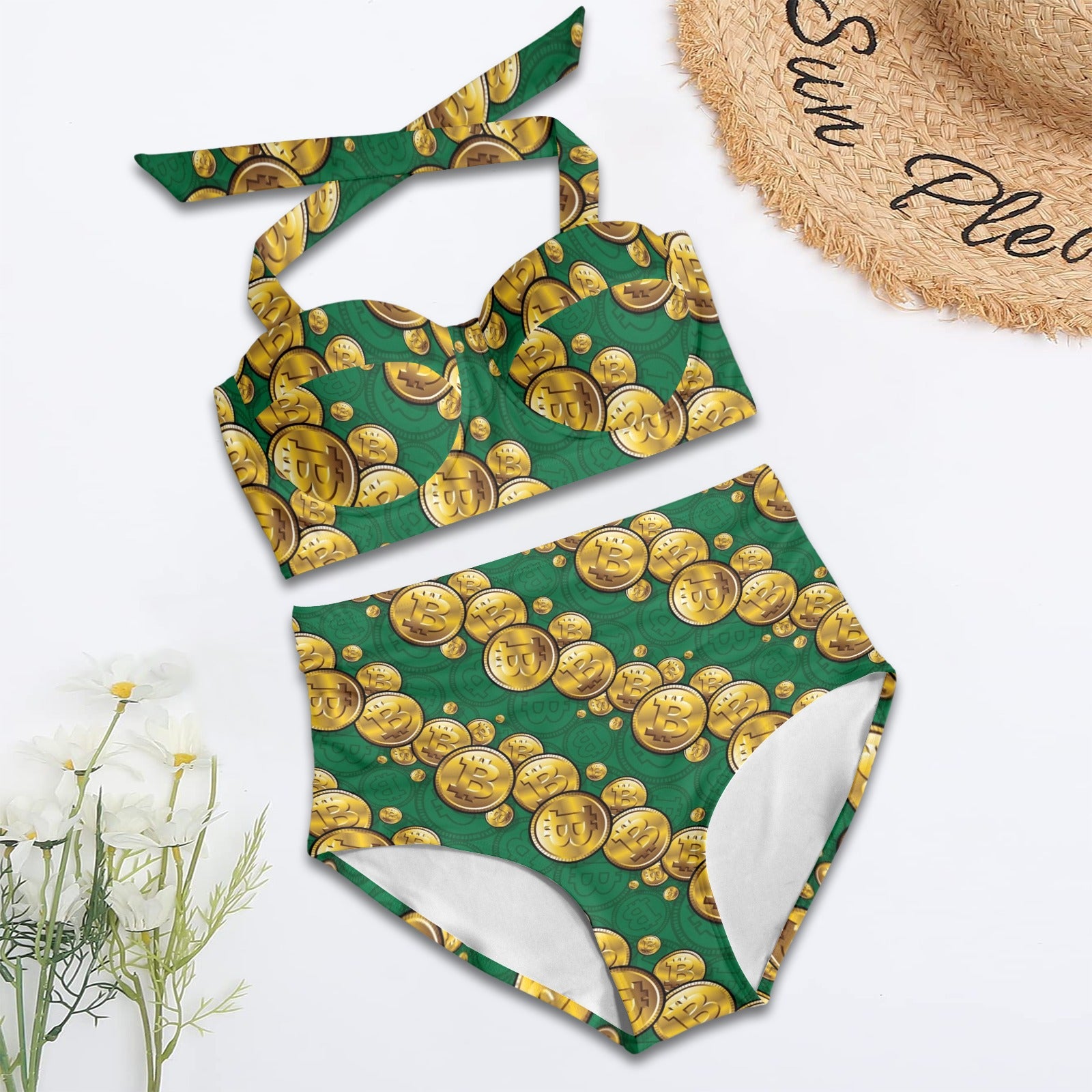 Bitcoin Pattern Print Design DO02 Halter Neck Bikini Swimsuit