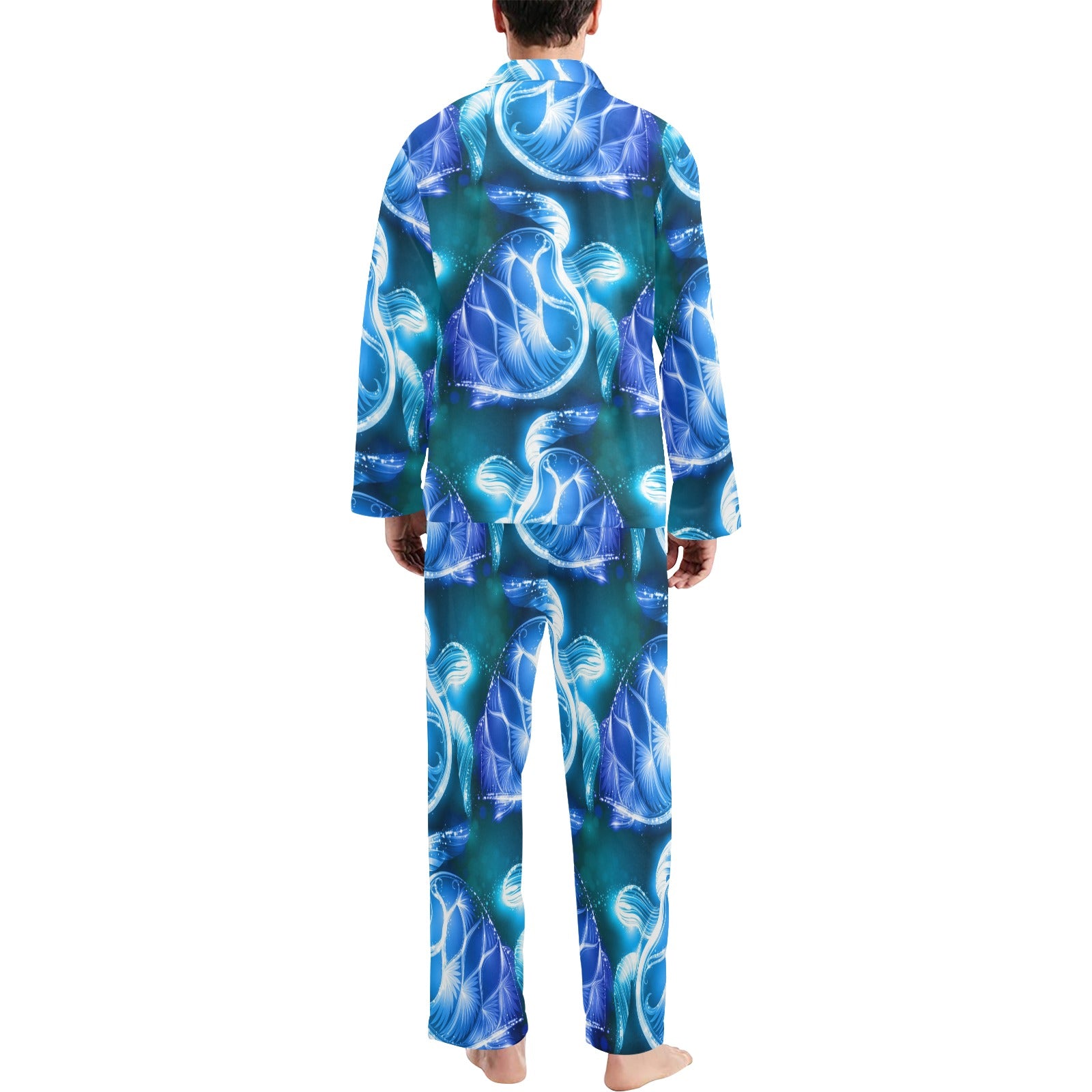 Blue Neon Sea Turtle Print Men's Long Pajama Set