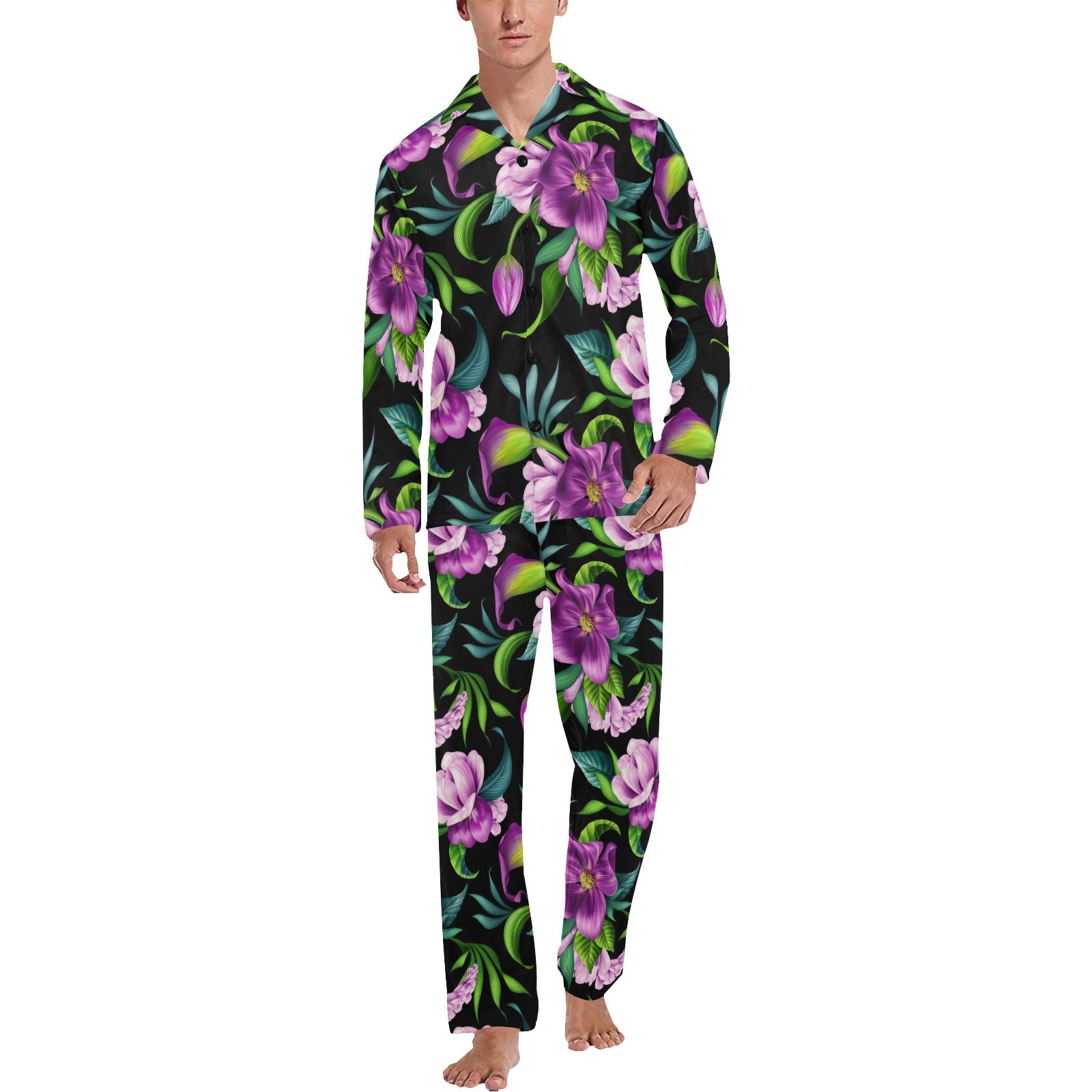 Bright Purple Floral Pattern Men's Long Pajama Set Made to Order Item. It is hand-cut and sewn just for your order! This process starts as soon as your order is placed and may have a processing time of 5-9 business days before it ships.