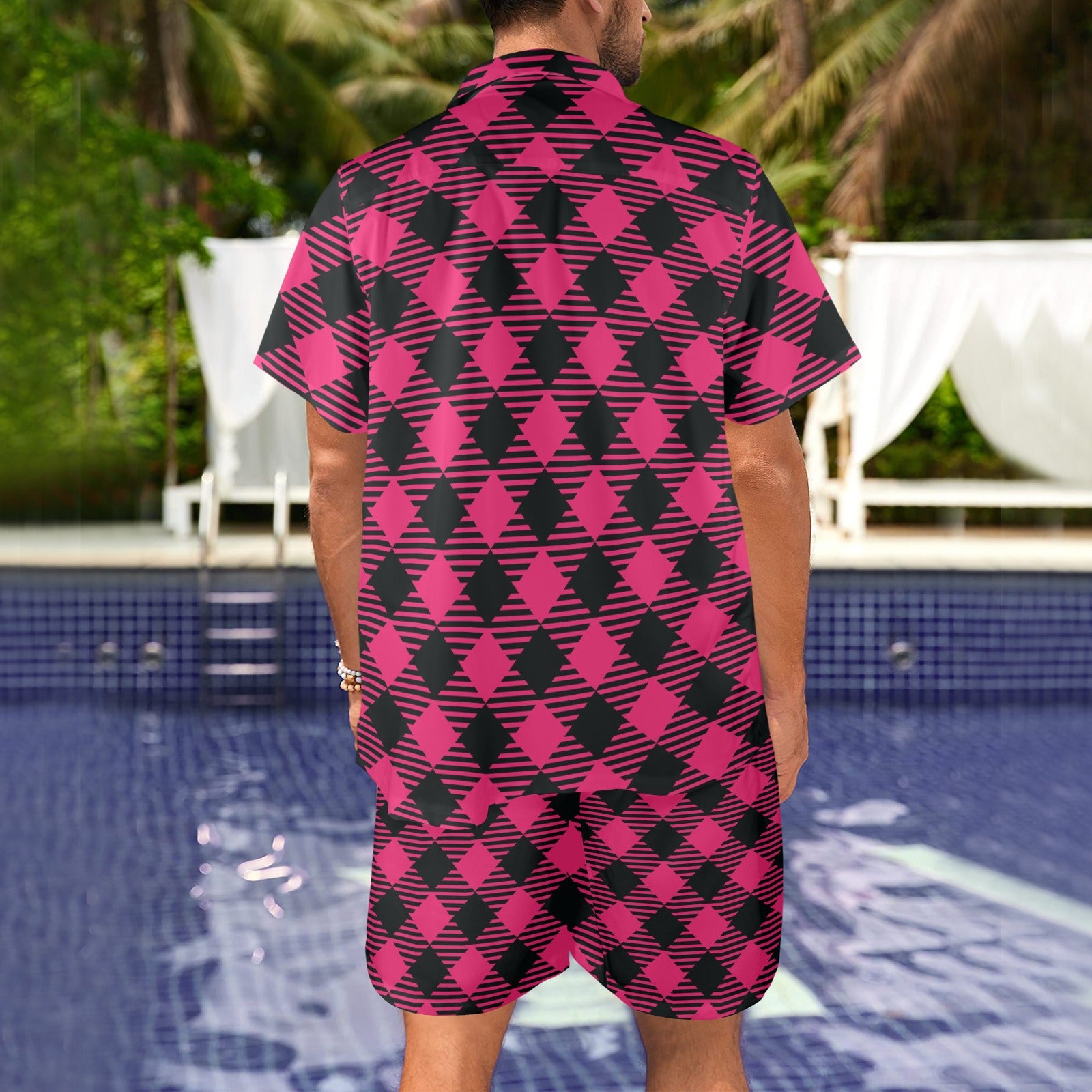 Buffalo check Pink Pattern Print Design 01 Men's Beach Shirt and Shorts Set. It is hand-cut and sewn just for your order! This process starts as soon as your order is placed and may have a processing time of 5-9 business days before it ships.