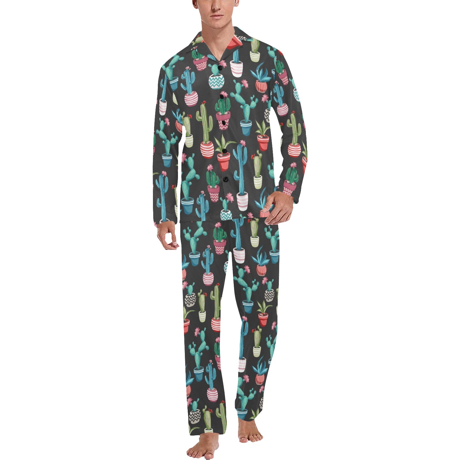 Cactus Pattern Print Design 02 Men's Long Pajama Set Made to Order Item. It is hand-cut and sewn just for your order! This process starts as soon as your order is placed and may have a processing time of 5-9 business days before it ships.