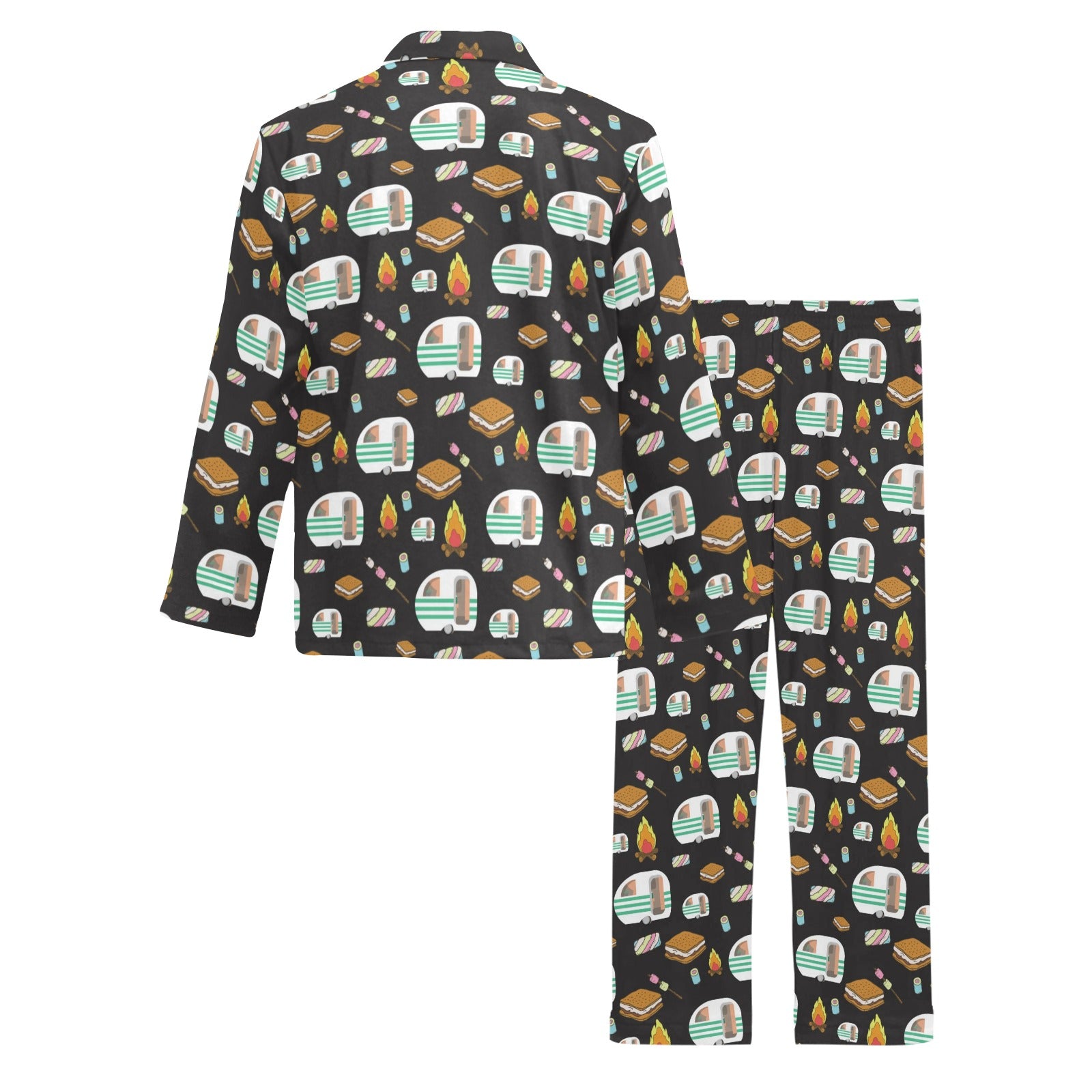 Camper marshmallow Camping Design Print Men's Long Pajama Set Made to Order Item. It is hand-cut and sewn just for your order! This process starts as soon as your order is placed and may have a processing time of 5-9 business days before it ships.