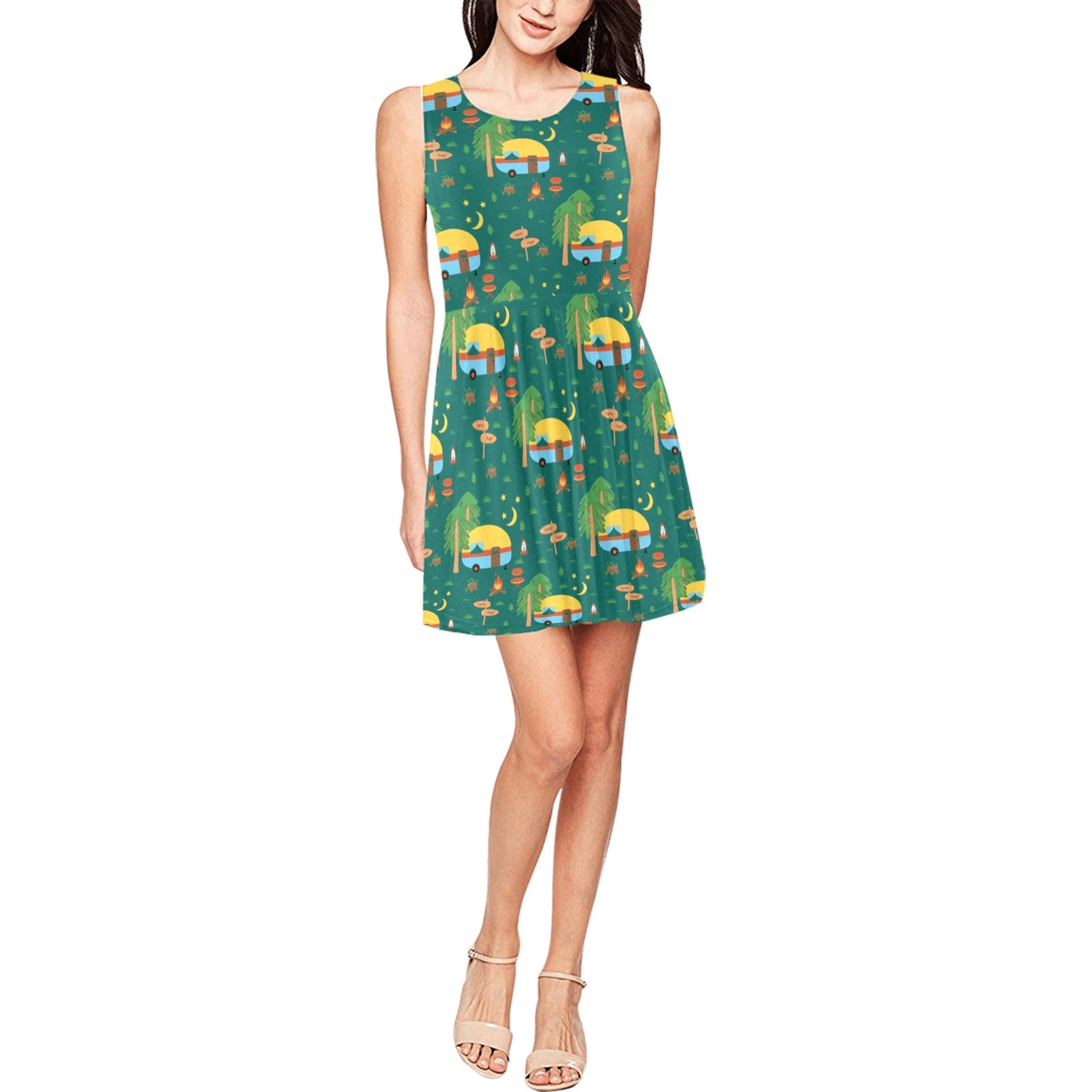 Camping Camper Pattern Print Design 06 Sleeveless Dress Made to Order Item. It is hand-cut and sewn just for your order! This process starts as soon as your order is placed and may have a processing time of 5-9 business days before it ships.