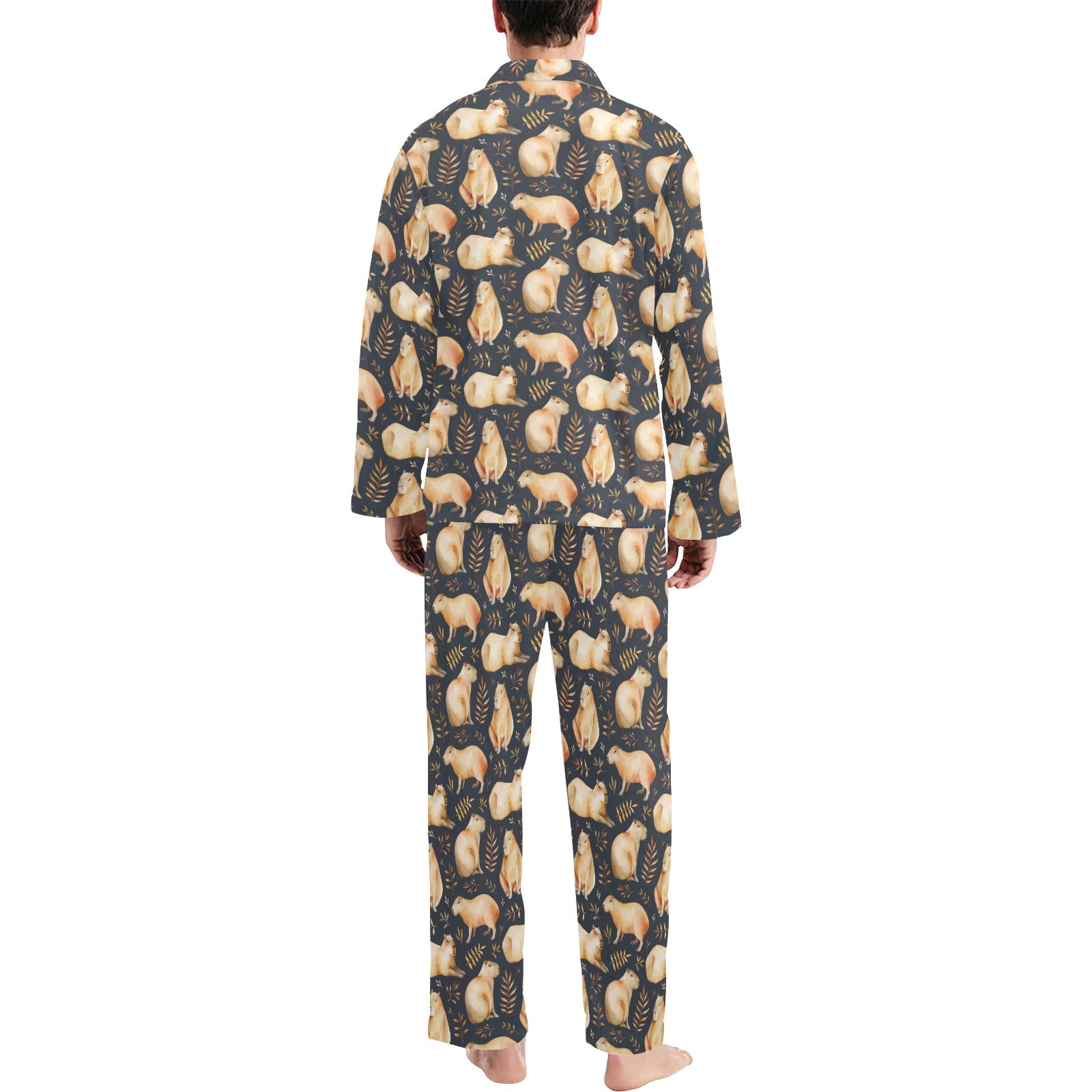 Capybara Pattern Print Design 02 Men's Long Pajama Set Made to Order Item. It is hand-cut and sewn just for your order! This process starts as soon as your order is placed and may have a processing time of 5-9 business days before it ships.