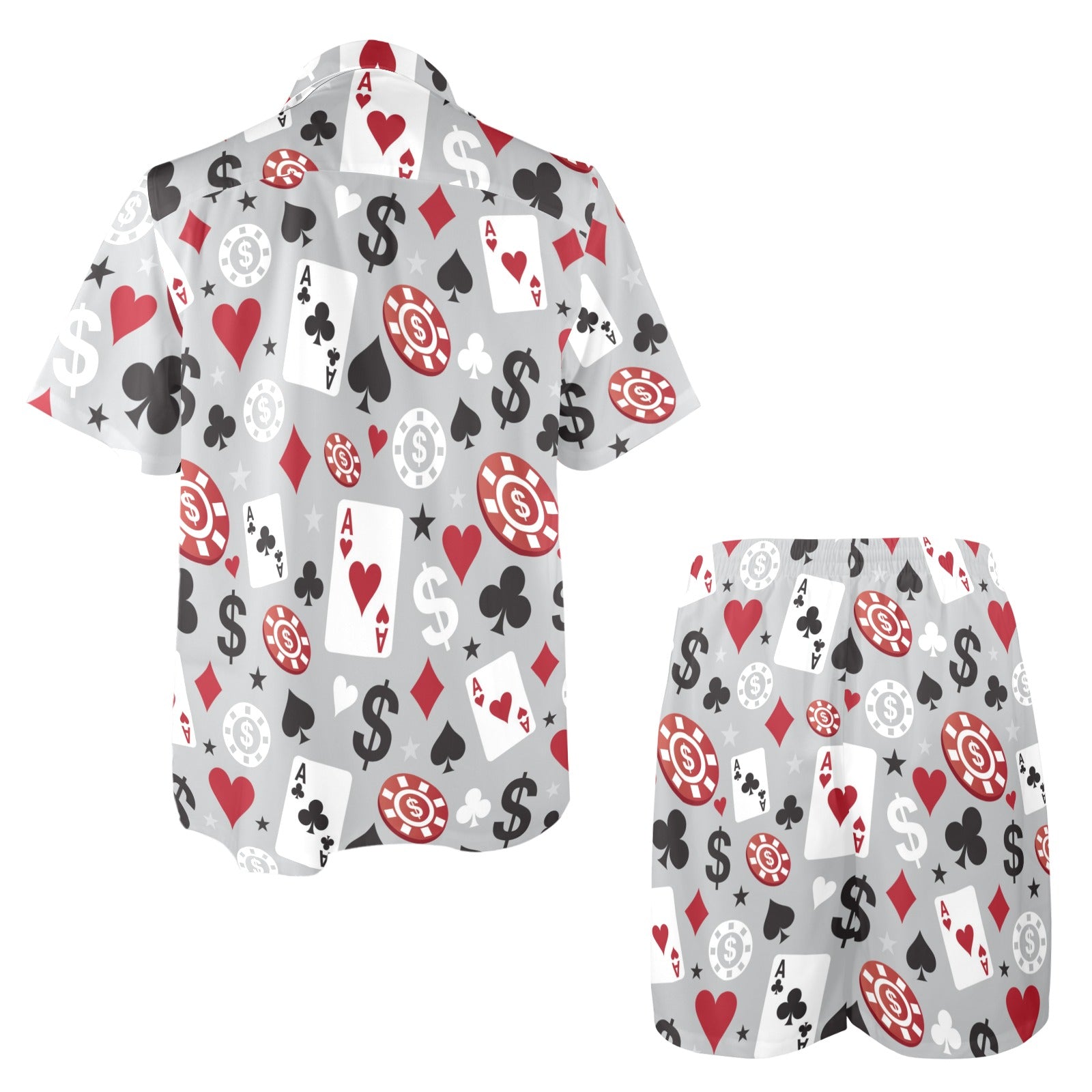 Casino Pattern Print Design 01 Men's Beach Shirt and Shorts Set. It is hand-cut and sewn just for your order! This process starts as soon as your order is placed and may have a processing time of 5-9 business days before it ships.