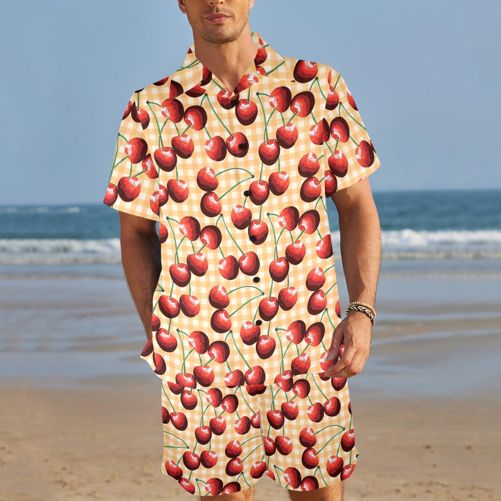 Cherry Orange Plaid Print Men's Beach Shirt and Shorts Set. It is hand-cut and sewn just for your order! This process starts as soon as your order is placed and may have a processing time of 5-9 business days before it ships.