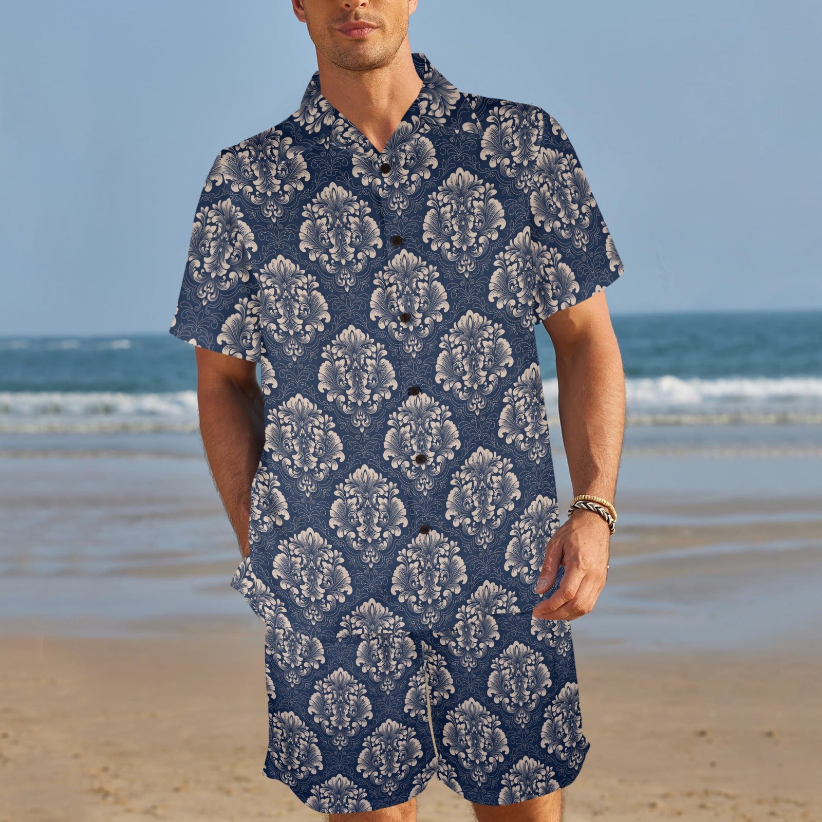 Damask Blue Luxury Print Pattern Men's Beach Shirt and Shorts Set