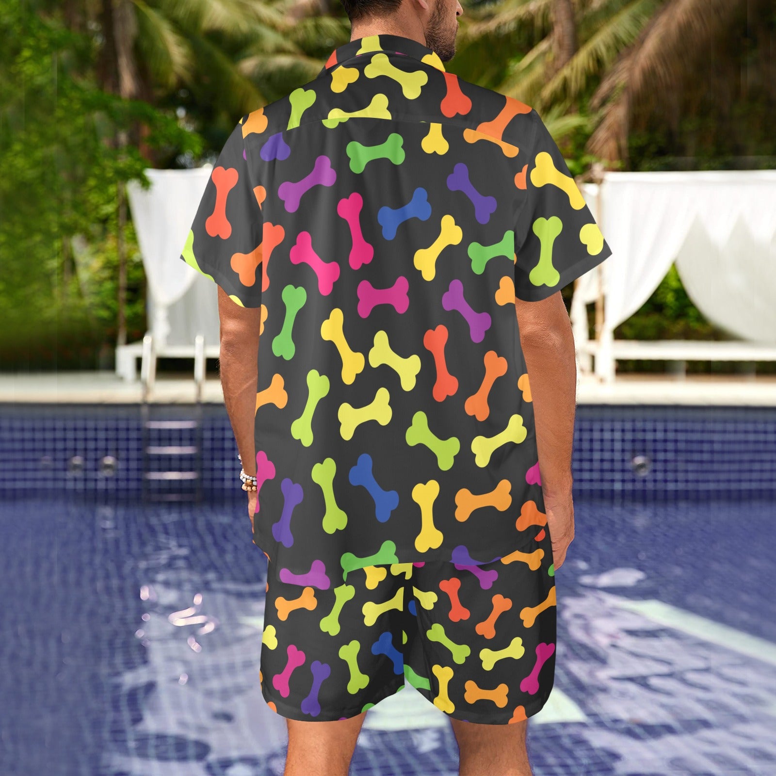 Dog Bone Neon Color Pattern Print Design 02 Men's Beach Shirt and Shorts Set. It is hand-cut and sewn just for your order! This process starts as soon as your order is placed and may have a processing time of 5-9 business days before it ships.