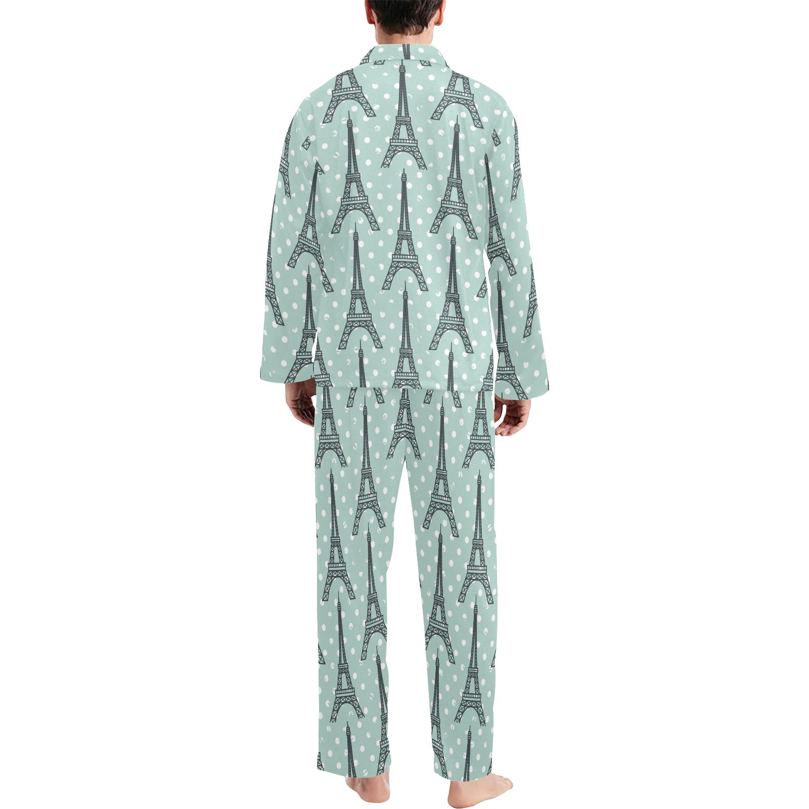 Eiffel Tower Polka Dot Print Men's Long Pajama Set custom-made-to-order and handcrafted to the highest quality standards.