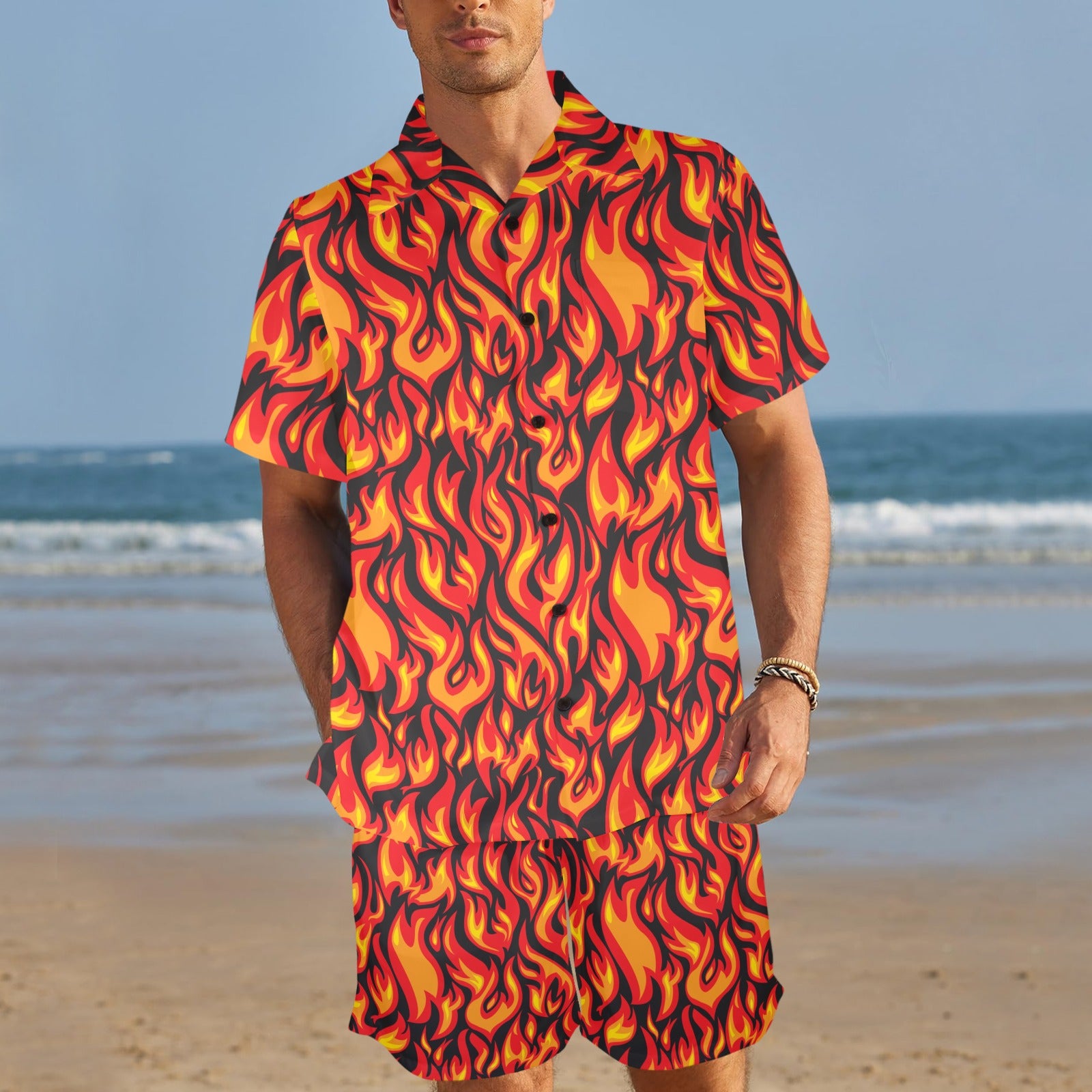 Flame Fire Print Pattern Men's Beach Shirt and Shorts Set. It is hand-cut and sewn just for your order! This process starts as soon as your order is placed and may have a processing time of 5-9 business days before it ships.