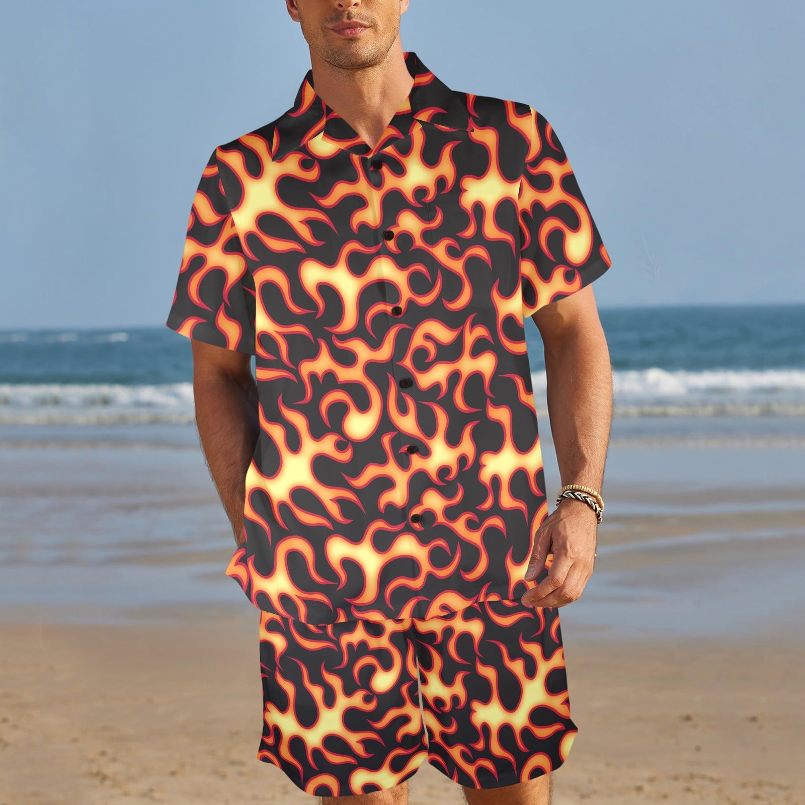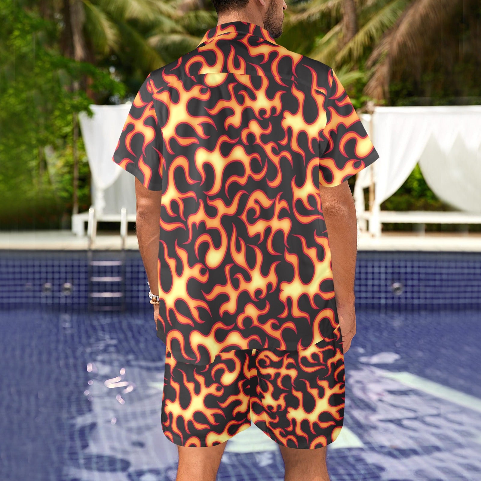 Flame Fire Themed Print Men's Beach Shirt and Shorts Set. It is hand-cut and sewn just for your order! This process starts as soon as your order is placed and may have a processing time of 5-9 business days before it ships.