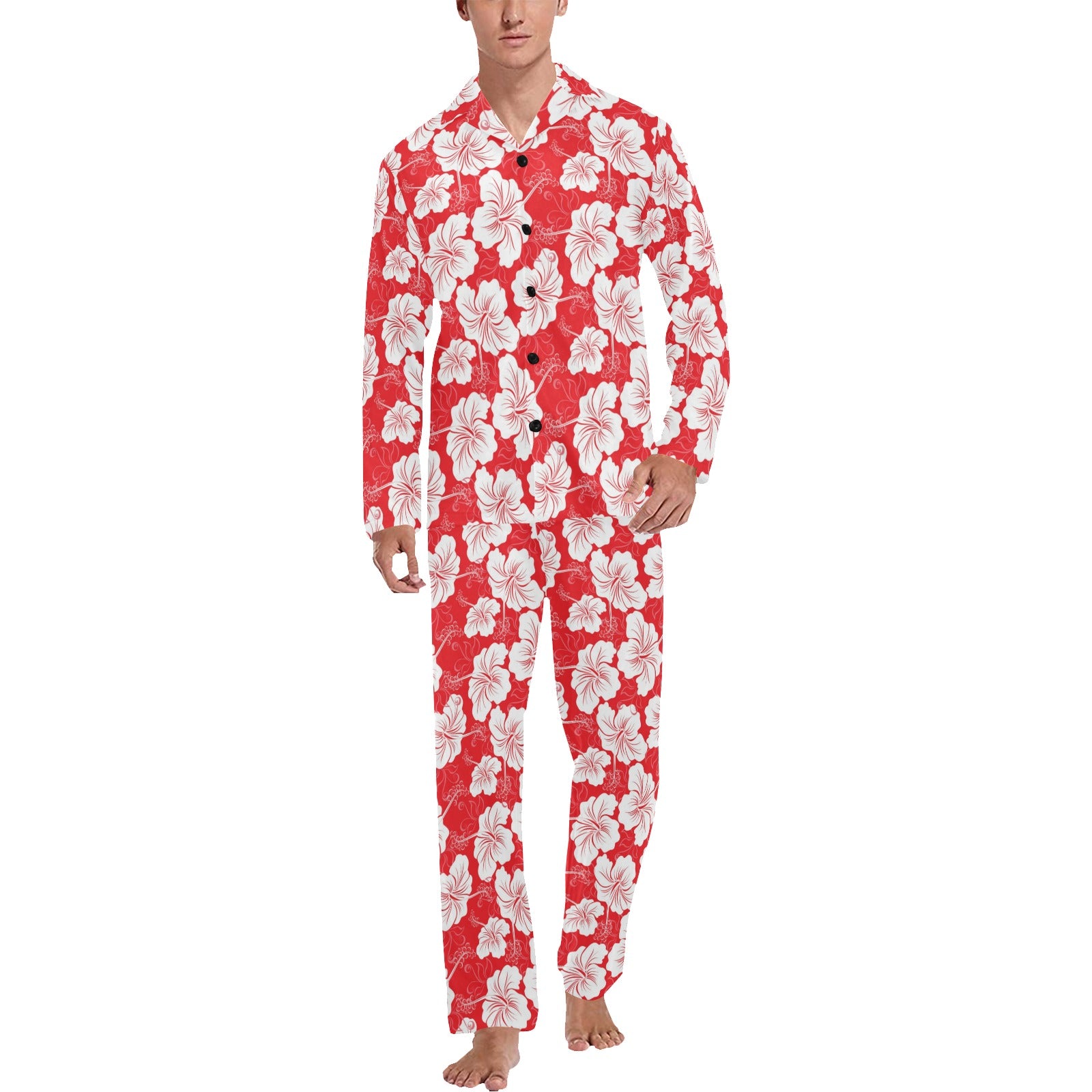 Flower Hawaiian Hibiscus Red Background Print Men's Long Pajama Set custom-made-to-order and handcrafted to the highest quality standards.