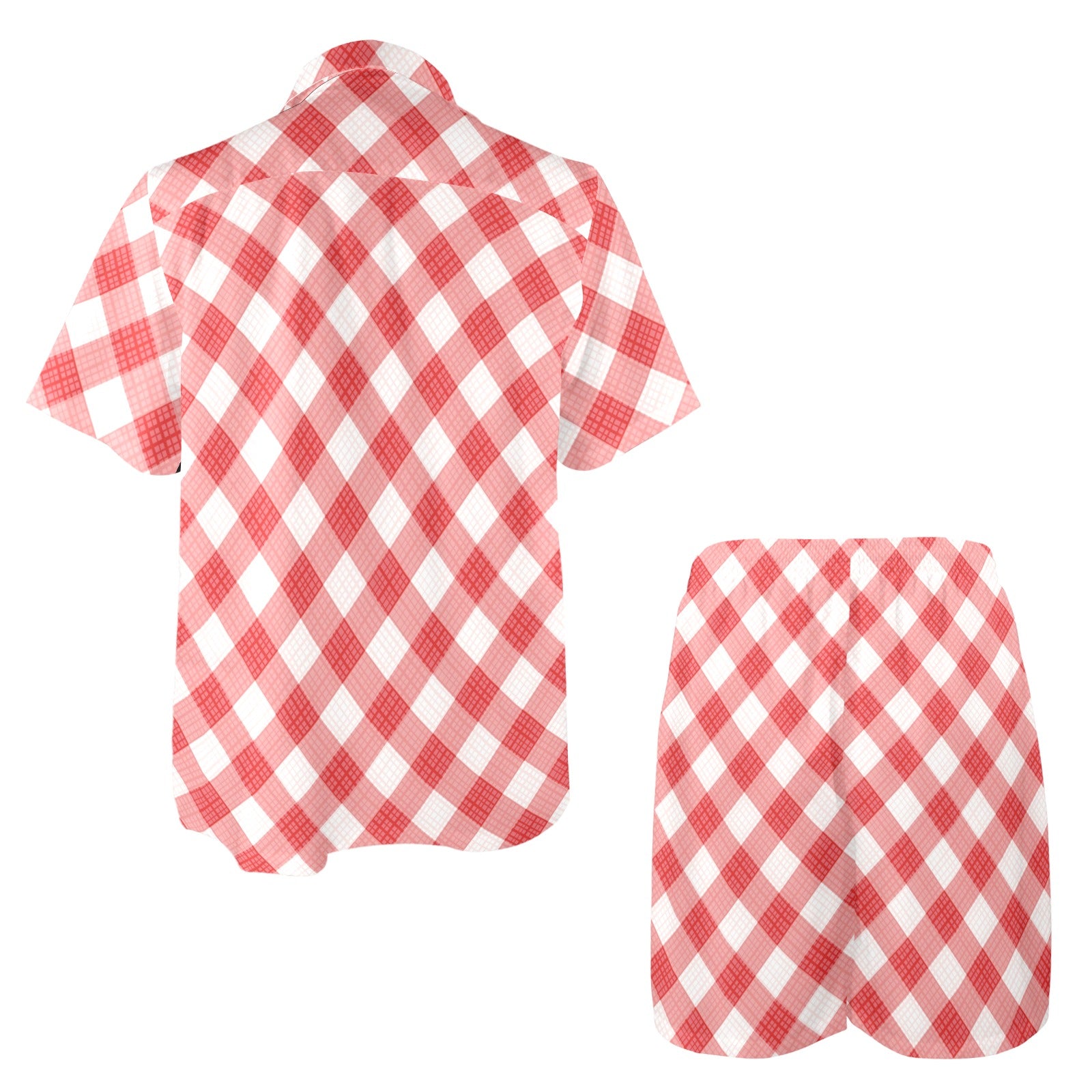 Gingham Red Pattern Print Design 01 Men's Beach Shirt and Shorts Set