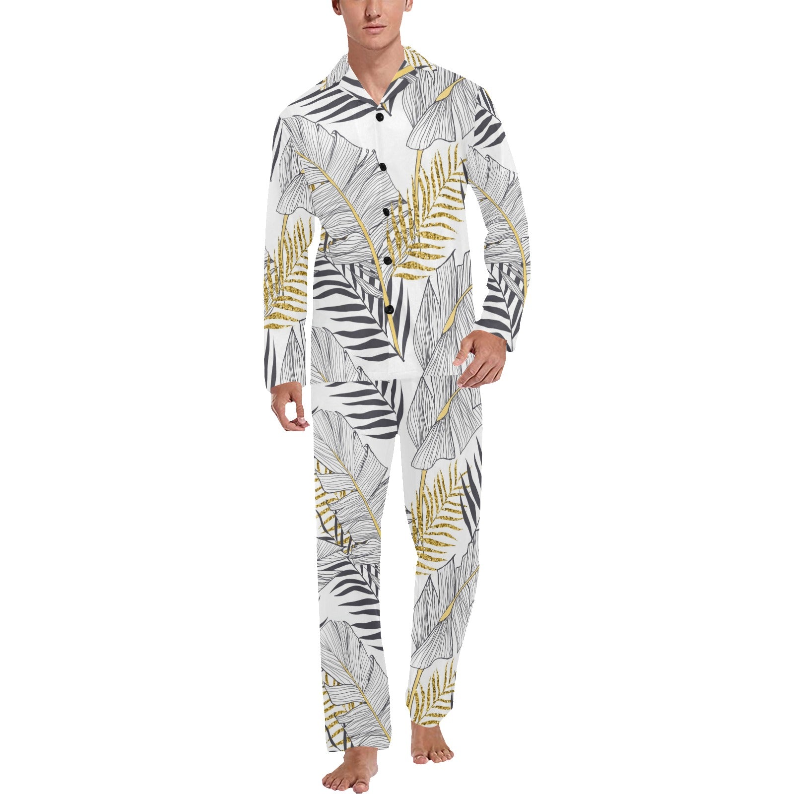 Gold Glitter Tropical Palm Leaves Men's Long Pajama Set Made to Order Item. It is hand-cut and sewn just for your order! This process starts as soon as your order is placed and may have a processing time of 5-9 business days before it ships.