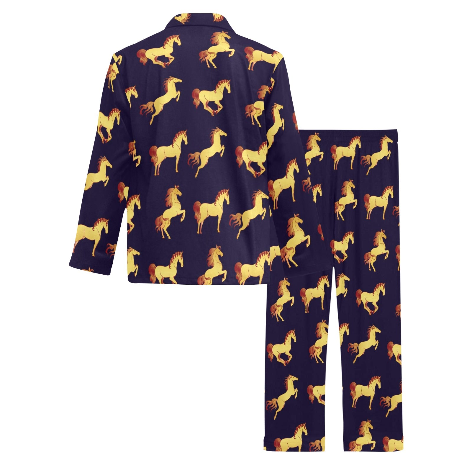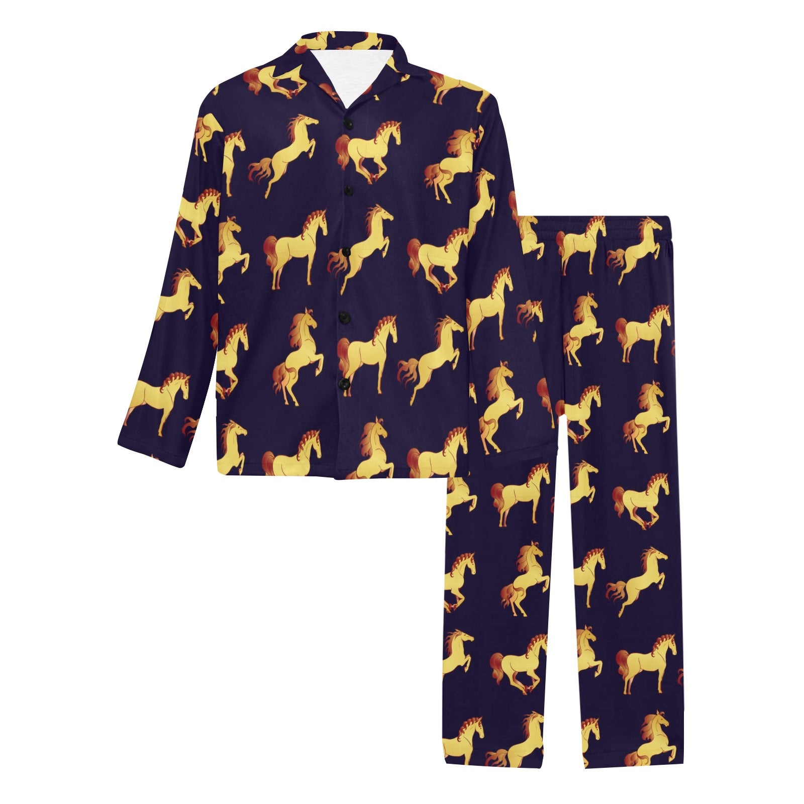 Gold Horse Pattern Men's Long Pajama Set Made to Order Item. It is hand-cut and sewn just for your order! This process starts as soon as your order is placed and may have a processing time of 5-9 business days before it ships.