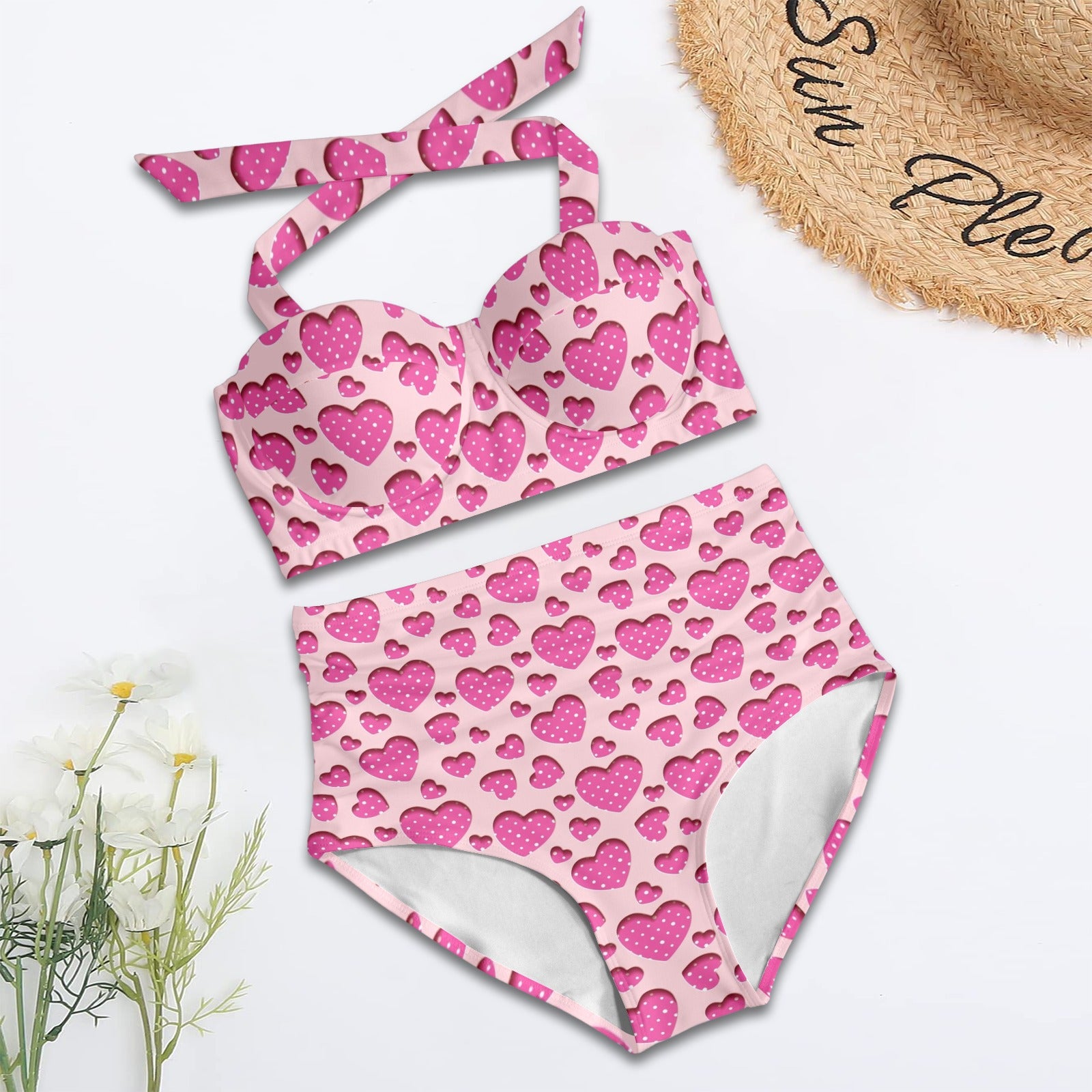 Heart Pink Pattern Print Design HE06 Halter Neck Bikini Swimsuit made-to-order and handcrafted to the highest quality standards.