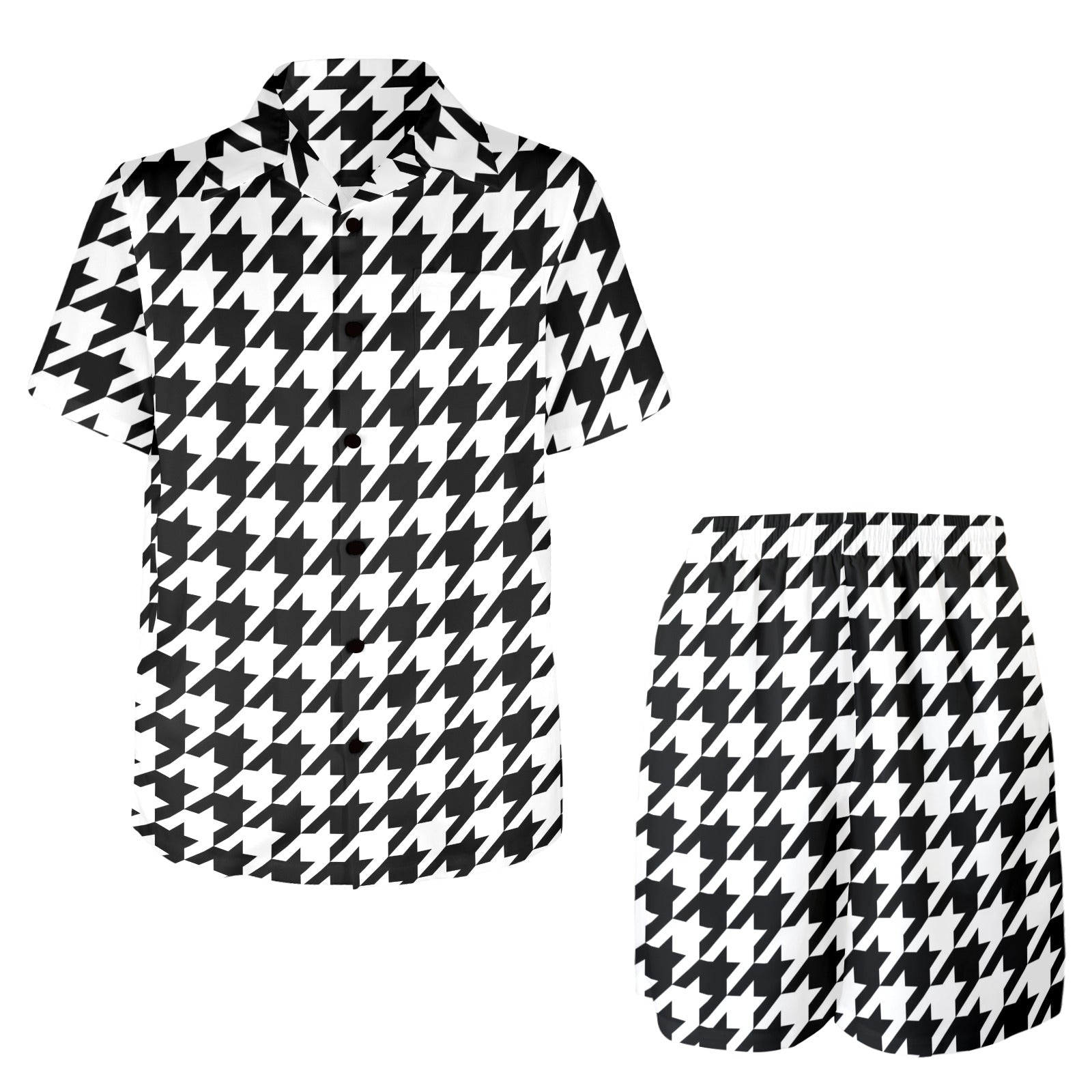 Houndstooth Black White Pattern Print Design 05 Men's Beach Shirt and Shorts Set