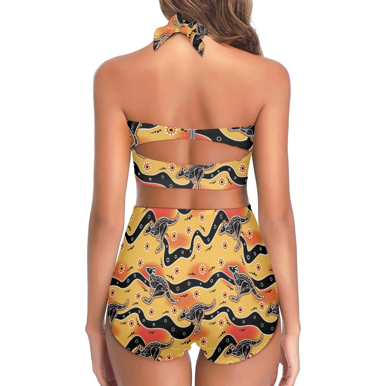 Kangaroos Aboriginal Pattern Print Design 06 Halter Neck Bikini Swimsuit made-to-order and handcrafted to the highest quality standards.