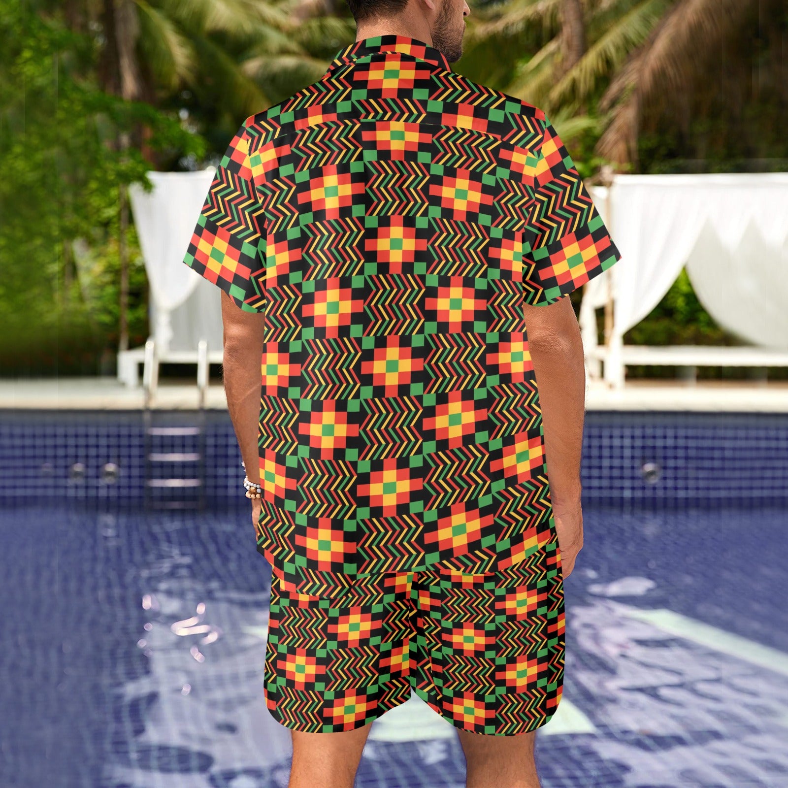Kente Pattern Print Design 01 Men's Beach Shirt and Shorts Set. It is hand-cut and sewn just for your order! This process starts as soon as your order is placed and may have a processing time of 5-9 business days before it ships.
