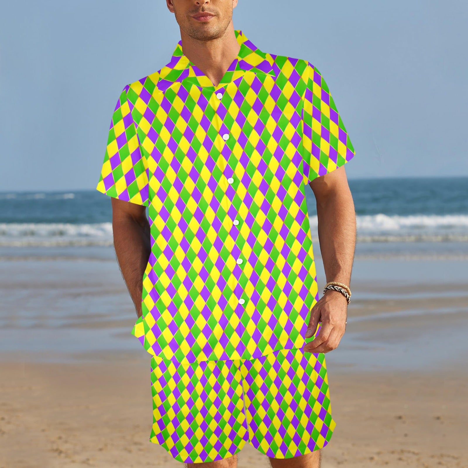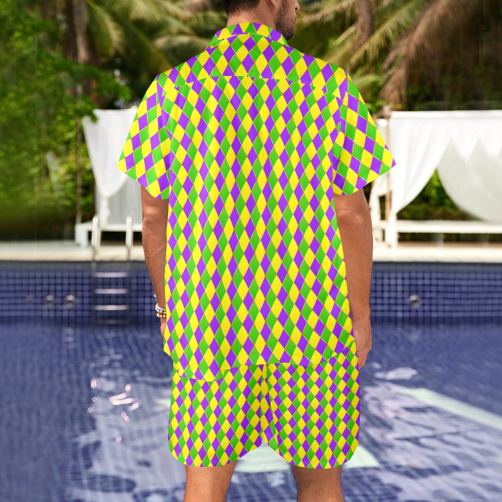 Mardi Gras Pattern Print Design 01 Men's Beach Shirt and Shorts Set. It is hand-cut and sewn just for your order! This process starts as soon as your order is placed and may have a processing time of 5-9 business days before it ships.