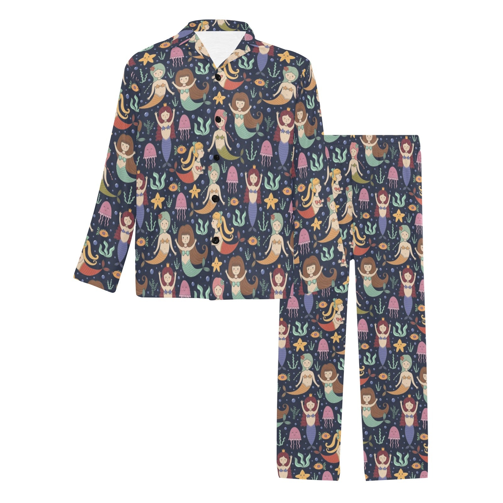 Mermaid Cartoon Pattern Print Design 03 Men's Long Pajama Set custom-made-to-order and handcrafted to the highest quality standards.