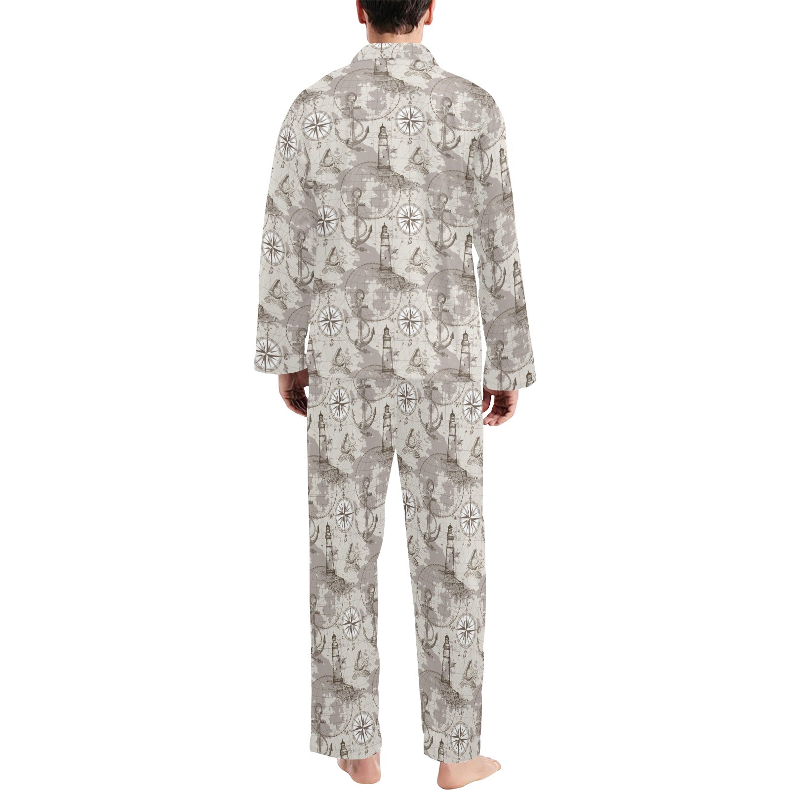 Nautical Map Design Themed Print Men's Long Pajama Set