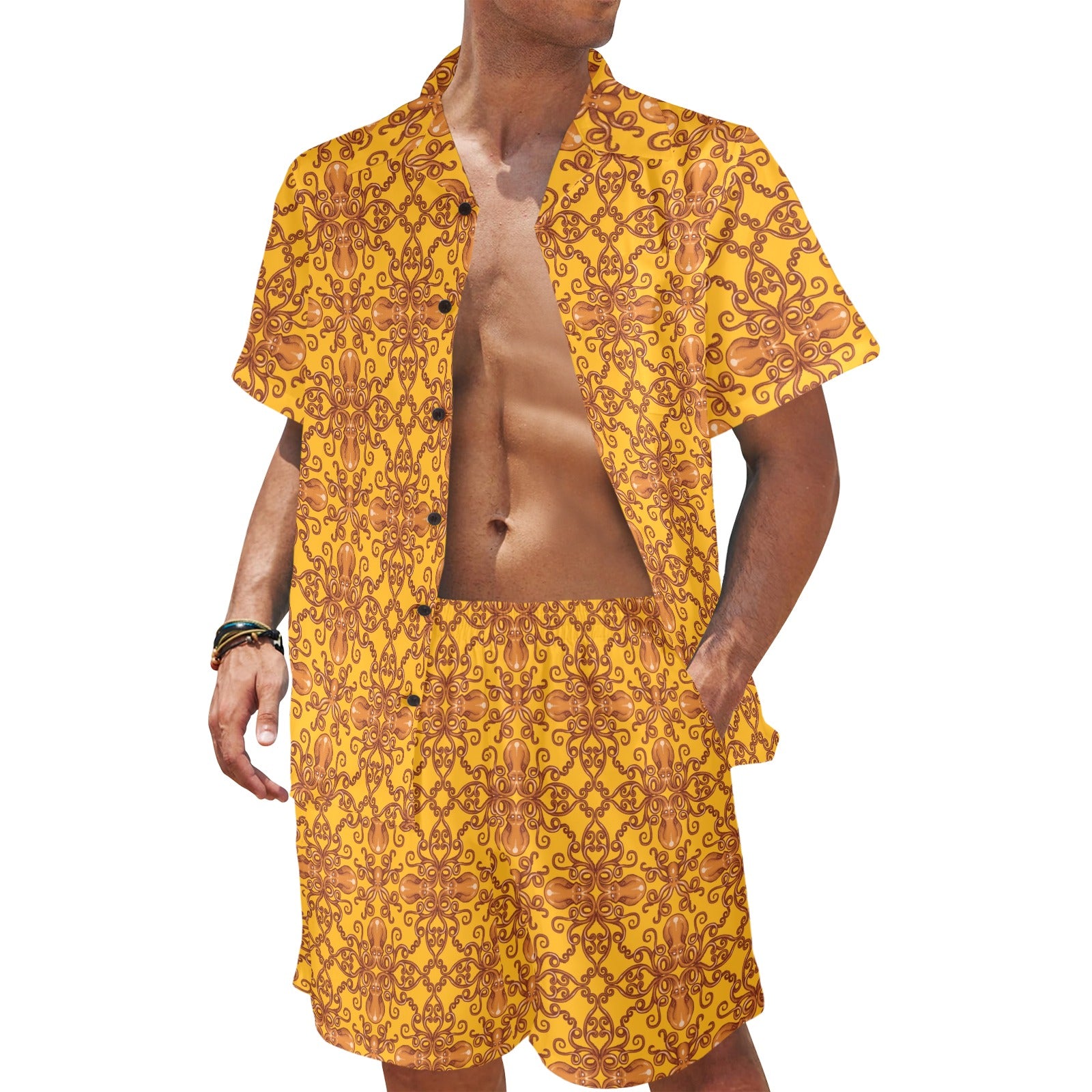 Octopus Background Design Print Men's Beach Shirt and Shorts Set. It is hand-cut and sewn just for your order! This process starts as soon as your order is placed and may have a processing time of 5-9 business days before it ships.