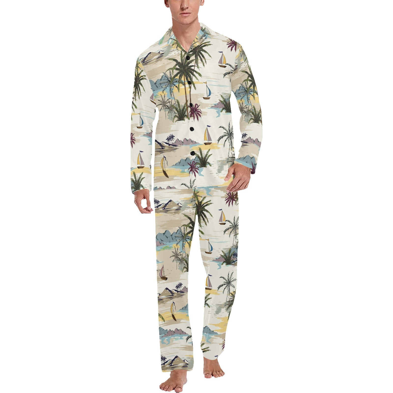 Palm Tree Beach Print Men's Long Pajama Set Made to Order Item. It is hand-cut and sewn just for your order! This process starts as soon as your order is placed and may have a processing time of 5-9 business days before it ships.