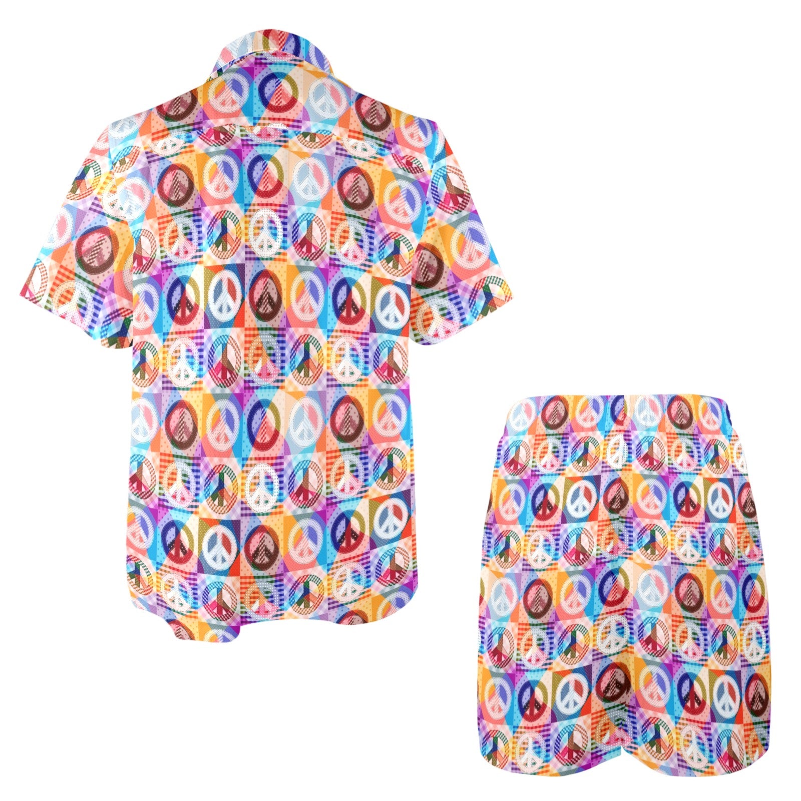 Peace Sign Patchwork Design Print Men's Beach Shirt and Shorts Set. It is hand-cut and sewn just for your order! This process starts as soon as your order is placed and may have a processing time of 5-9 business days before it ships.