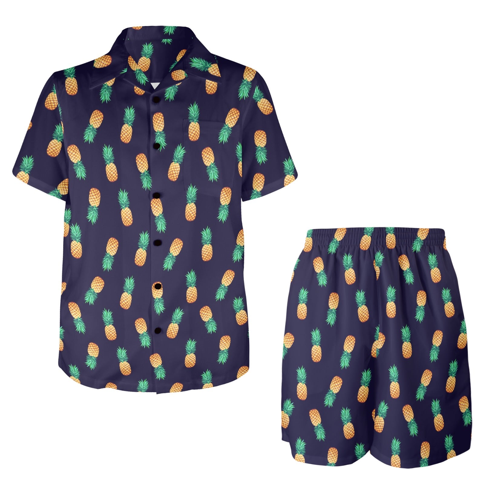 Pineapple Pattern Men's Beach Shirt and Shorts Set. It is hand-cut and sewn just for your order! This process starts as soon as your order is placed and may have a processing time of 5-9 business days before it ships.