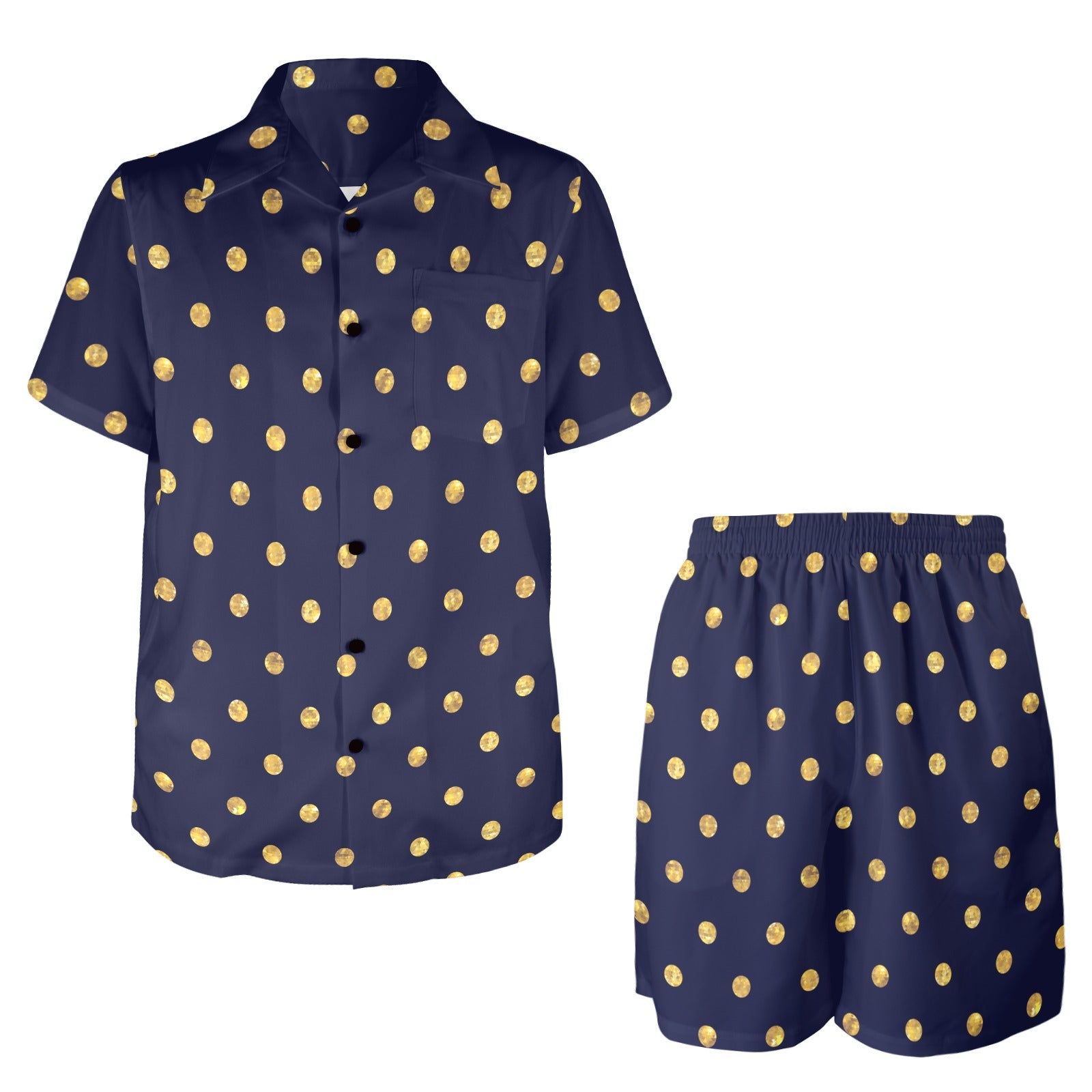 Polka Dot Gold Blue Pattern Print Design 02 Men's Beach Shirt and Shorts Set. It is hand-cut and sewn just for your order! This process starts as soon as your order is placed and may have a processing time of 5-9 business days before it ships.