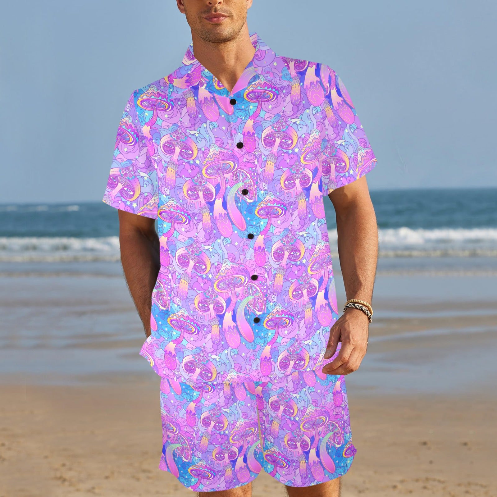 Psychedelic Trippy Mushroom Print Men's Beach Shirt and Shorts Set. It is hand-cut and sewn just for your order! This process starts as soon as your order is placed and may have a processing time of 5-9 business days before it ships.
