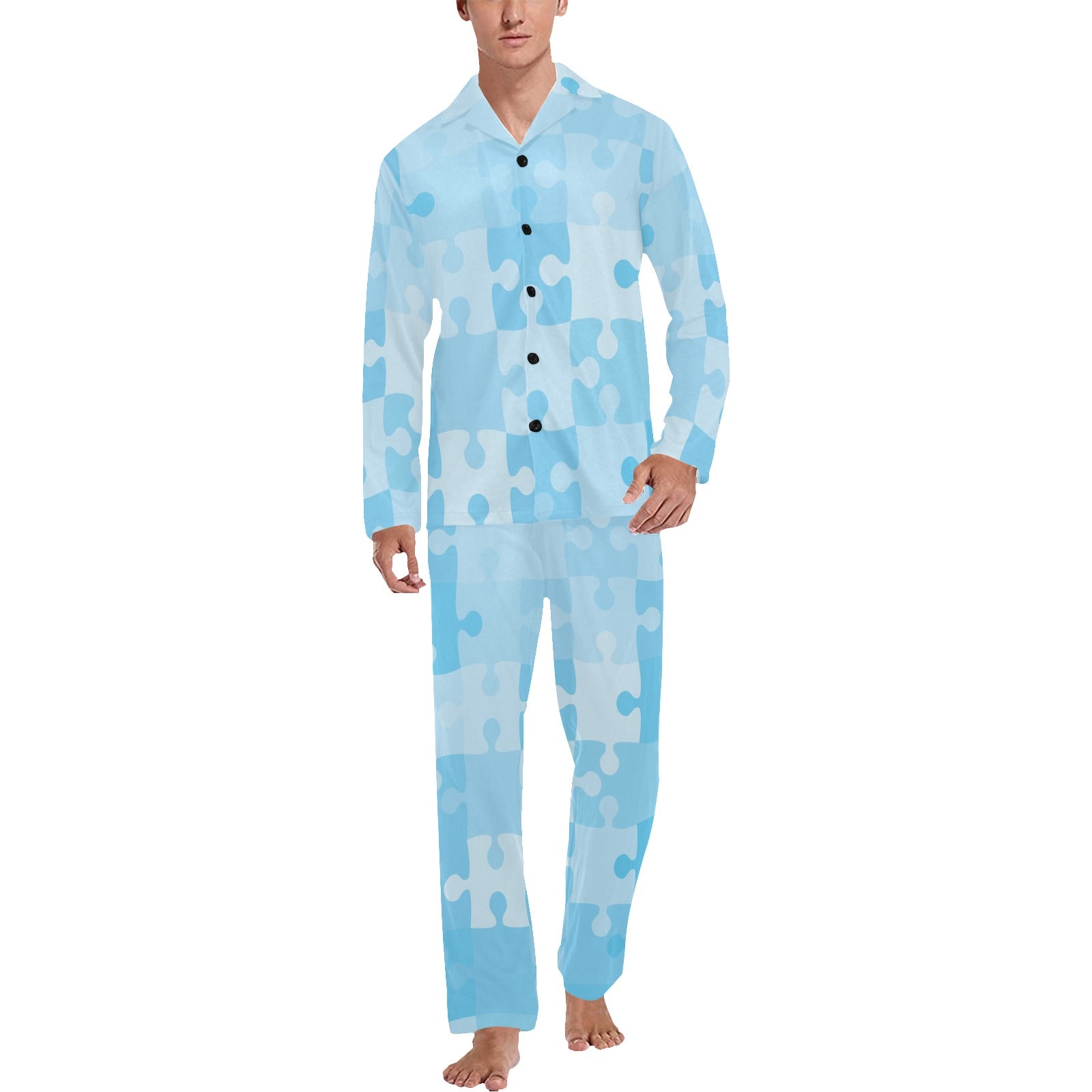 Puzzle Blue Pattern Print Design A04 Men's Long Pajama Set custom-made-to-order and handcrafted to the highest quality standards.
