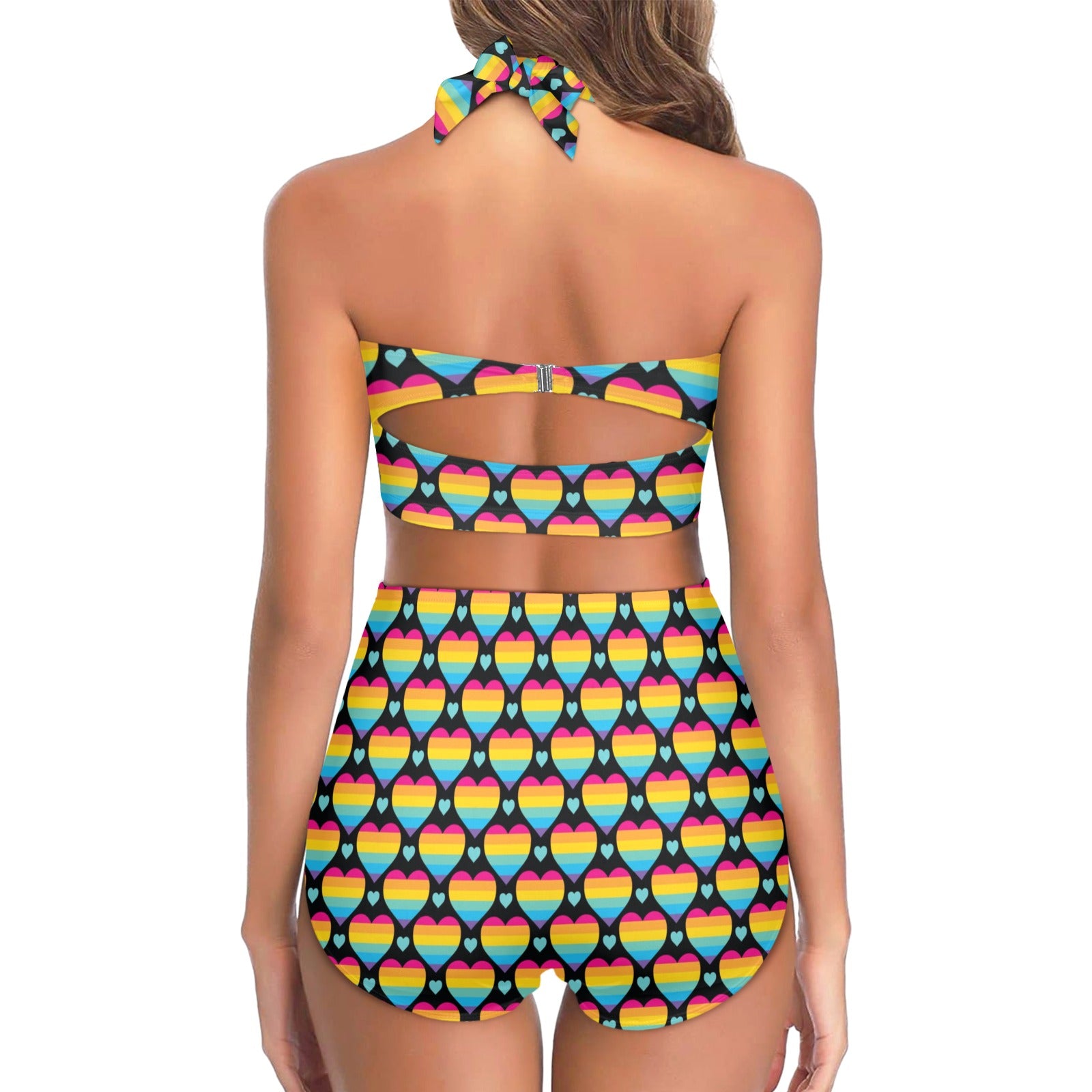 Rainbow Heart Print Pattern Halter Neck Bikini Swimsuit