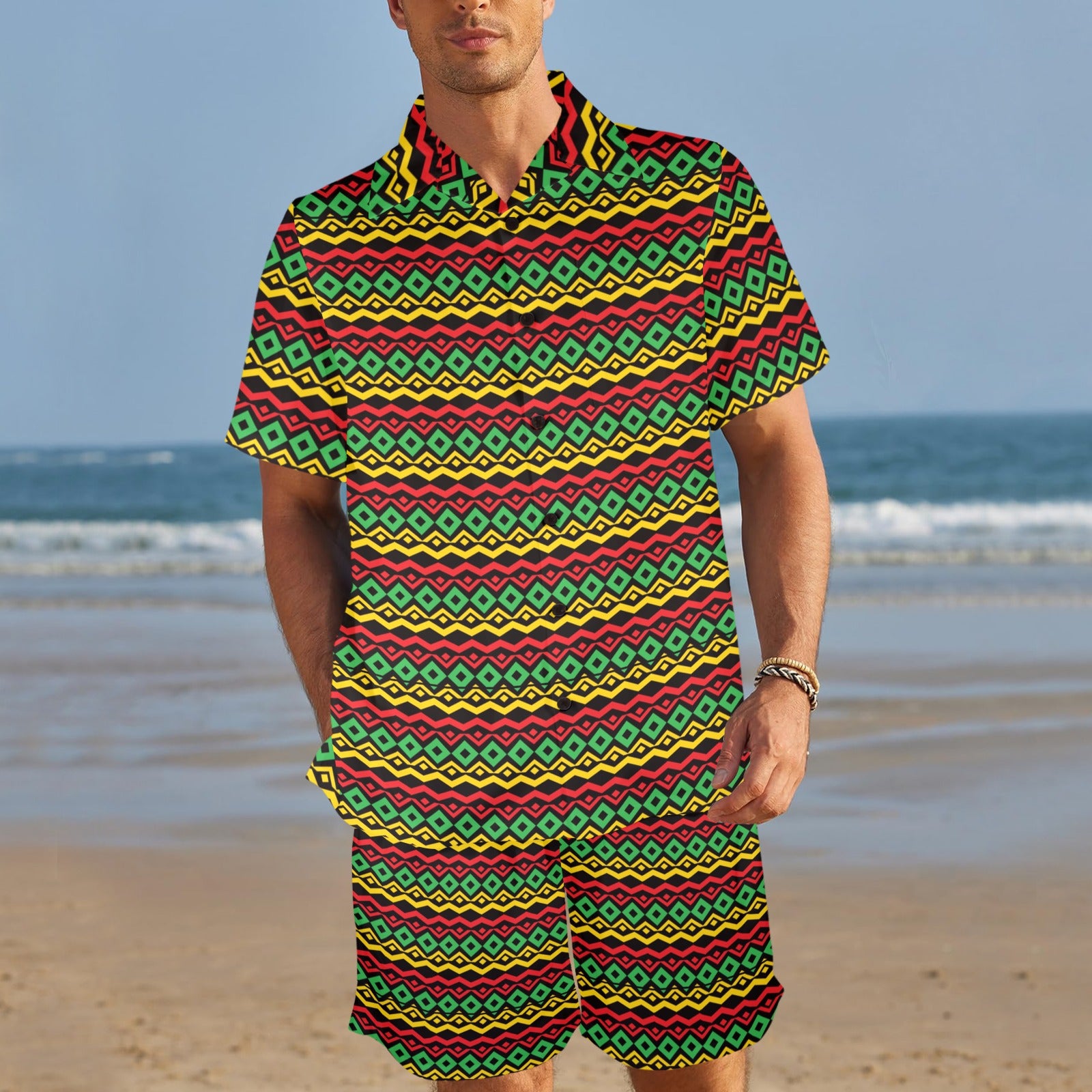 Rasta Reggae Color Themed Men's Beach Shirt and Shorts Set. It is hand-cut and sewn just for your order! This process starts as soon as your order is placed and may have a processing time of 5-9 business days before it ships.