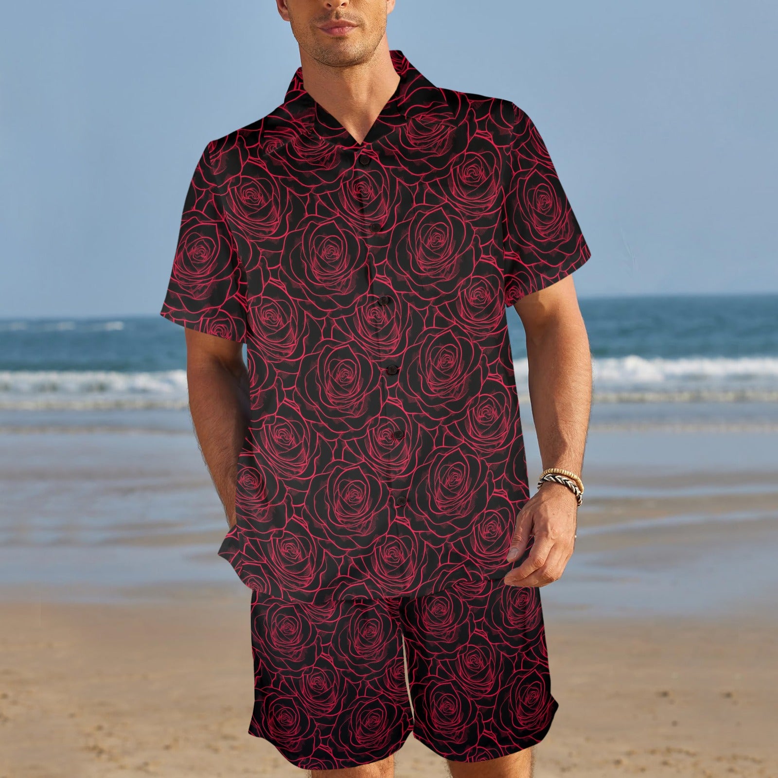 Red Rose Design Print Men's Beach Shirt and Shorts Set