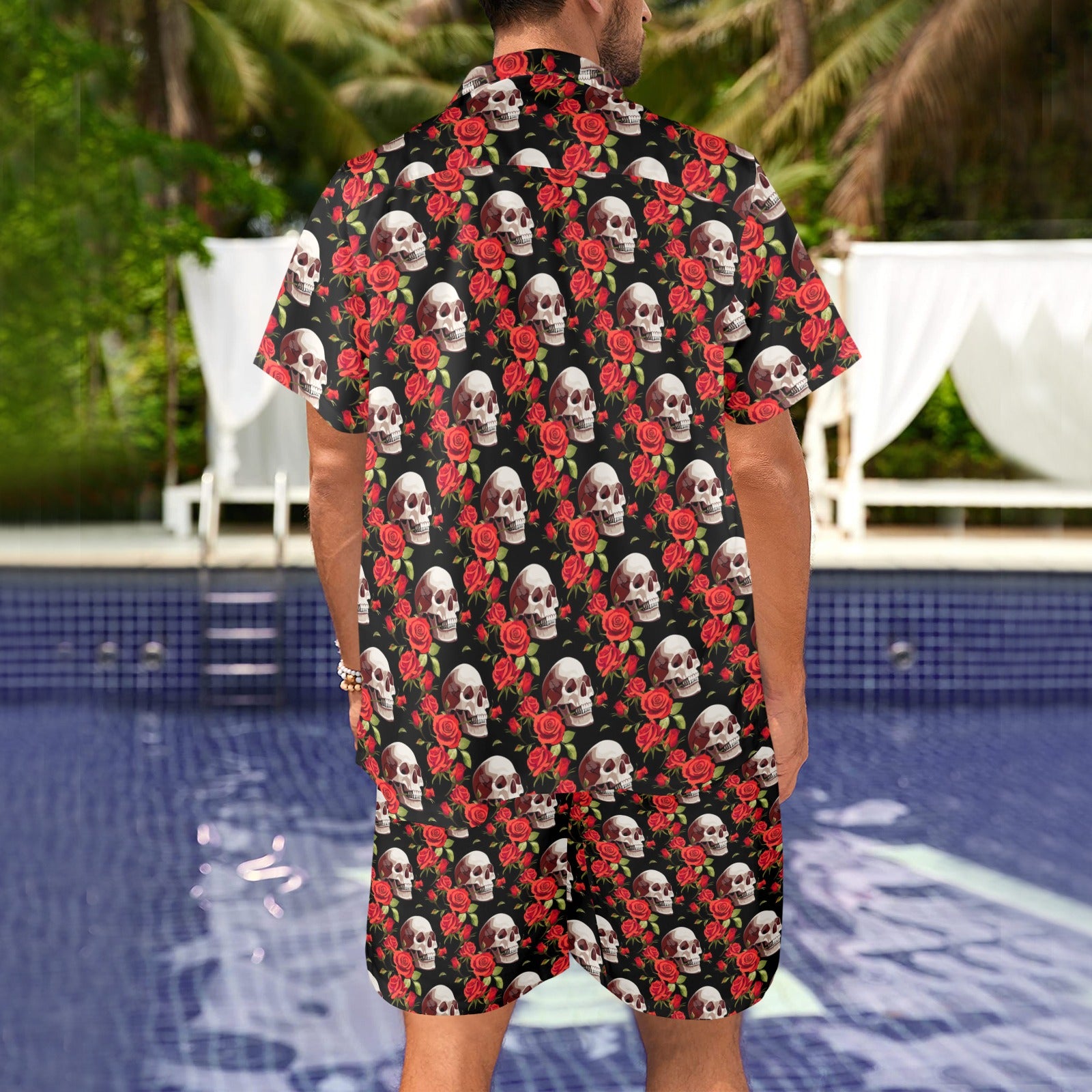 Red Rose Skull Design Print Men's Beach Shirt and Shorts Set. It is hand-cut and sewn just for your order! This process starts as soon as your order is placed and may have a processing time of 5-9 business days before it ships.