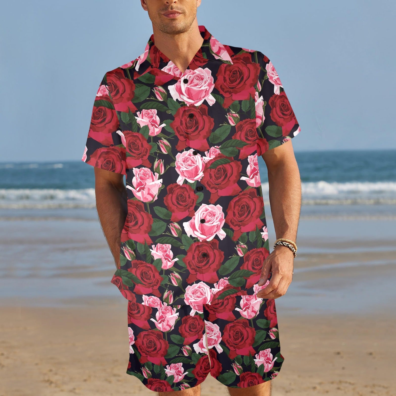 Rose Red Pink Pattern Print Design RO01 Men's Beach Shirt and Shorts Set. It is hand-cut and sewn just for your order! This process starts as soon as your order is placed and may have a processing time of 5-9 business days before it ships.
