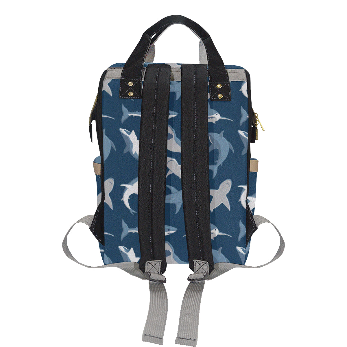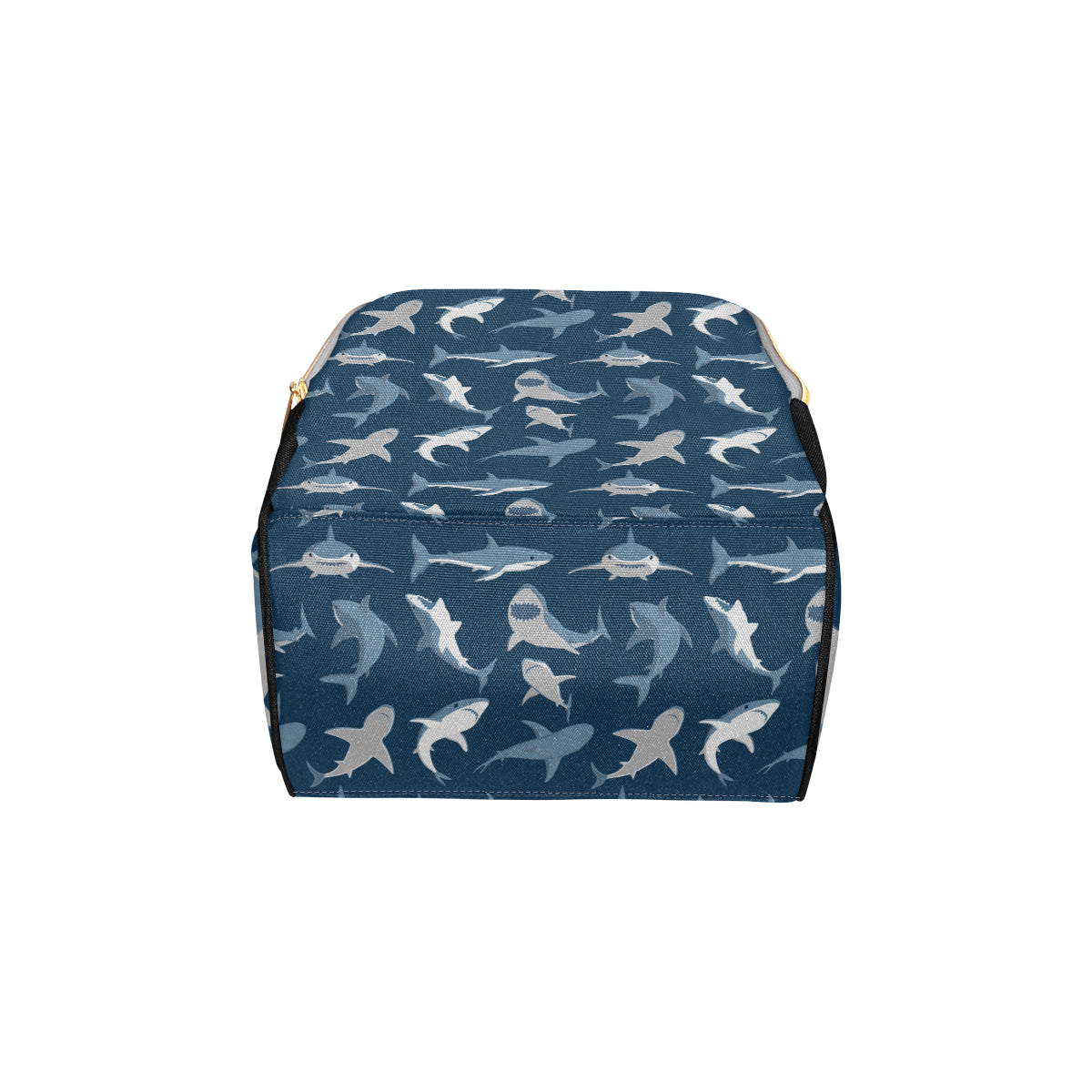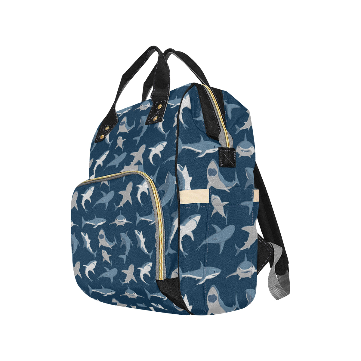 Shark Action Pattern Diaper Bag Backpack Made to Order Item. It is hand-cut and sewn just for your order! This process starts as soon as your order is placed and may have a processing time of 5-9 business days before it ships.
