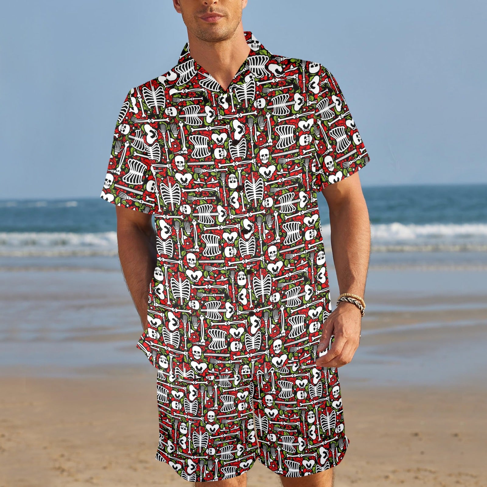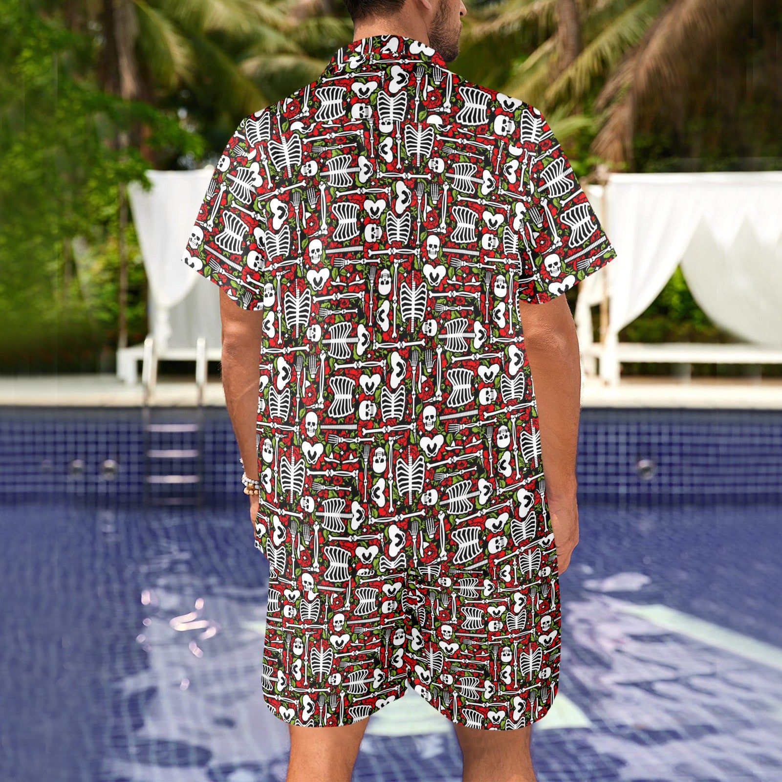 Skeleton Pattern Print Men's Beach Shirt and Shorts Set. It is hand-cut and sewn just for your order! This process starts as soon as your order is placed and may have a processing time of 5-9 business days before it ships.