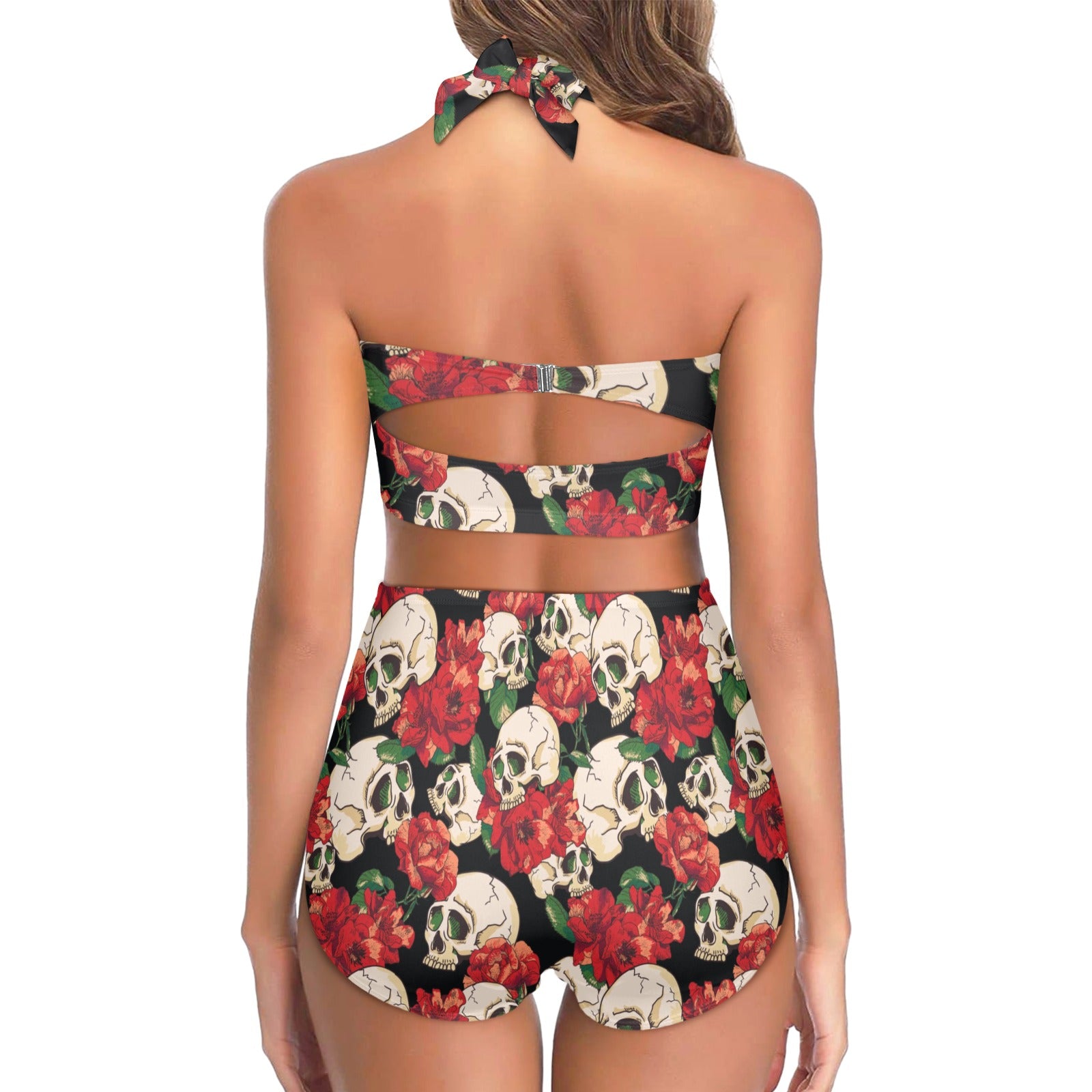 Skull Red Rose Halter Neck Bikini Swimsuit