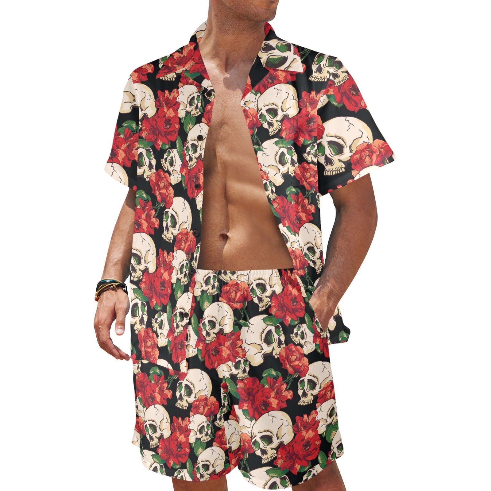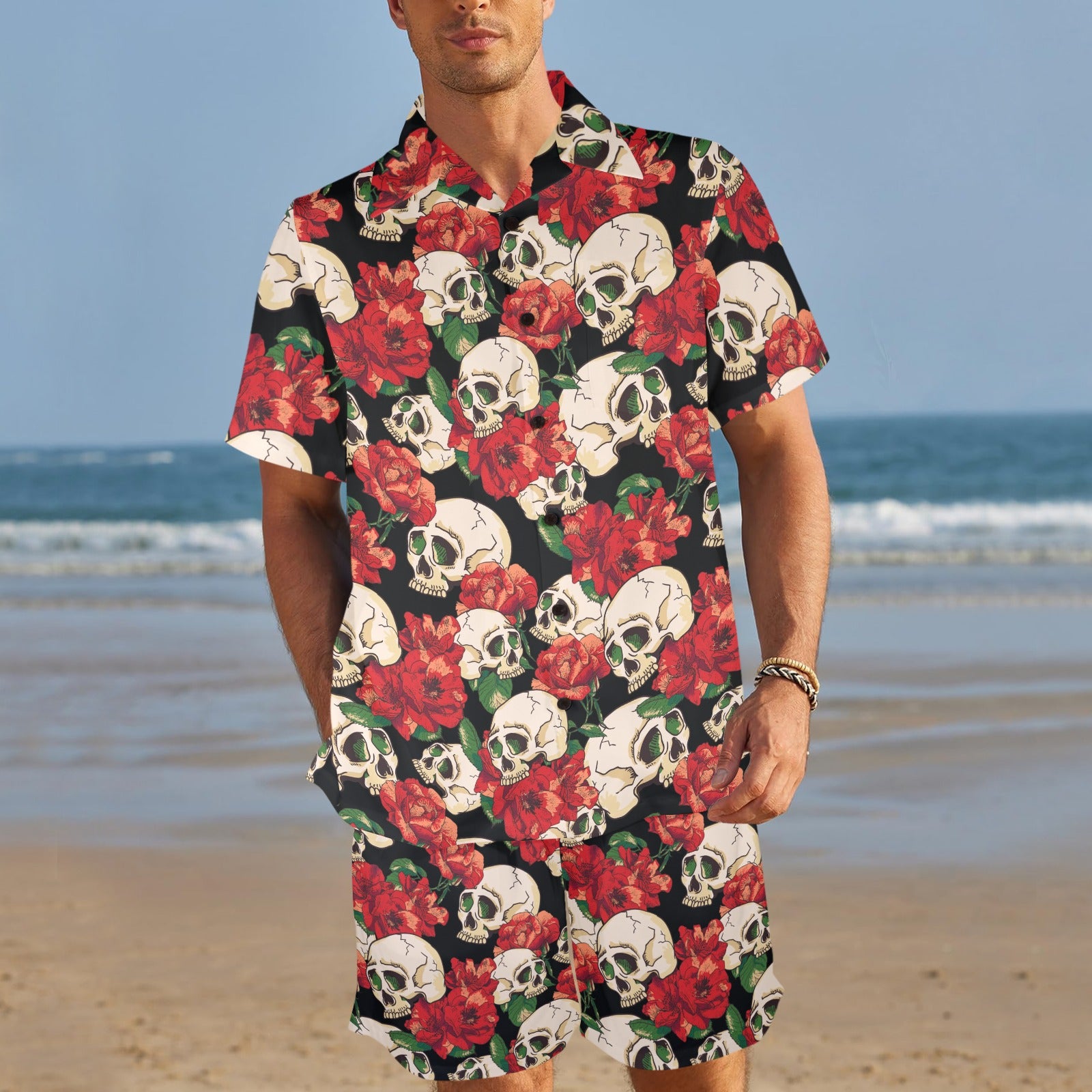 Skull Red Rose Men's Beach Shirt and Shorts Set