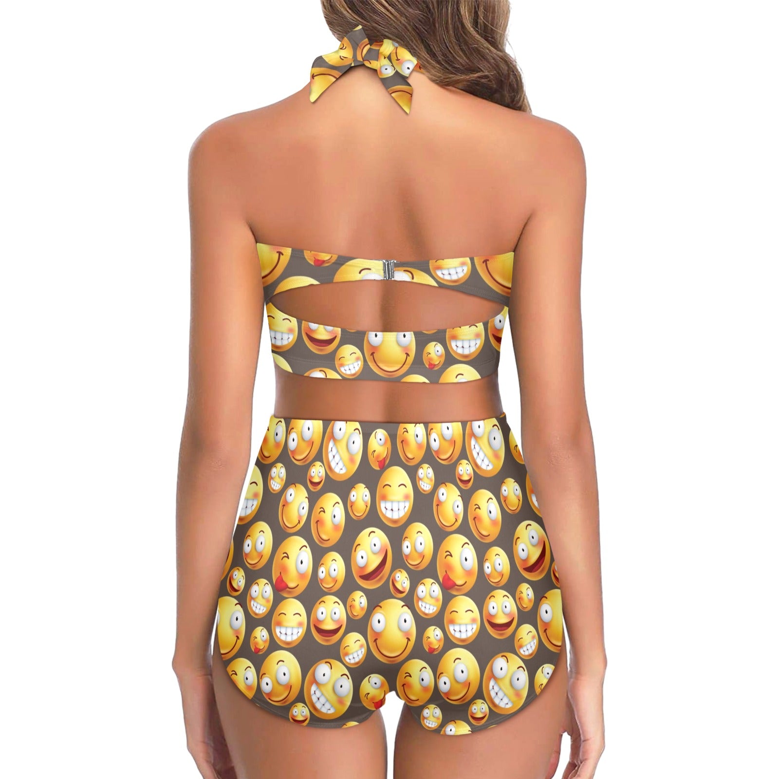 Smiley Face Emoji Print Design LKS303 Halter Neck Bikini Swimsuit made-to-order and handcrafted to the highest quality standards.