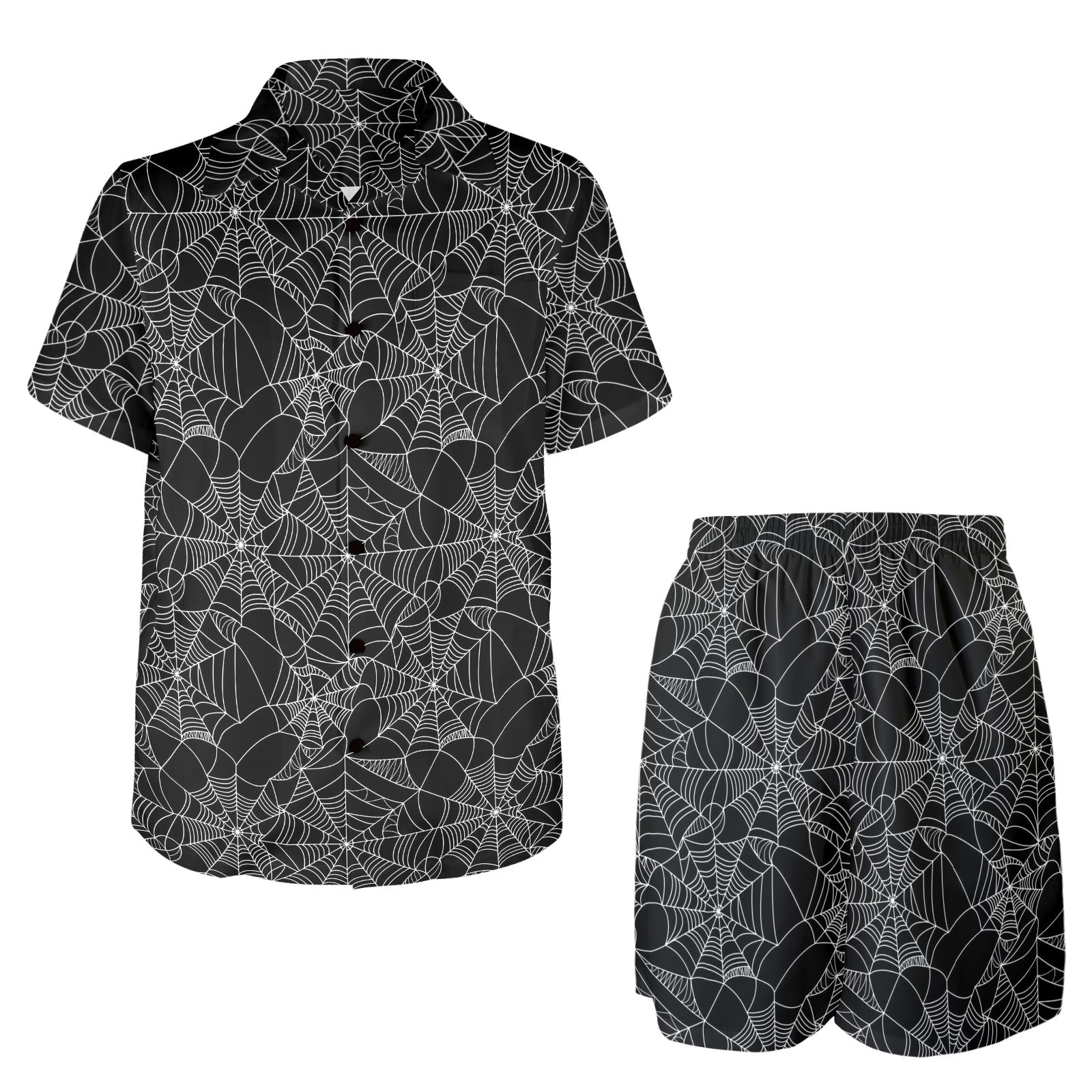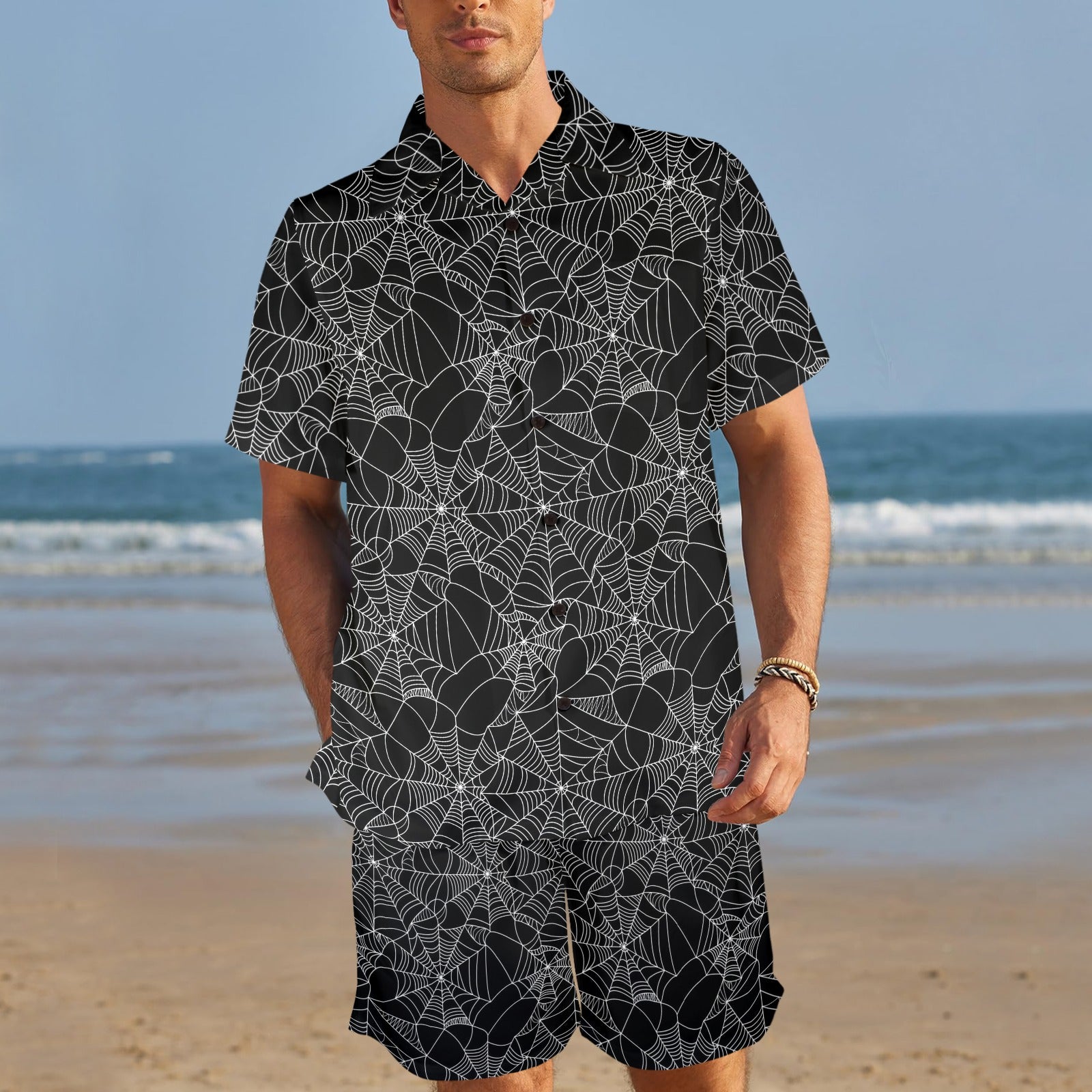 Spider Web Print Design LKS301 Men's Beach Shirt and Shorts Set. It is hand-cut and sewn just for your order! This process starts as soon as your order is placed and may have a processing time of 5-9 business days before it ships.