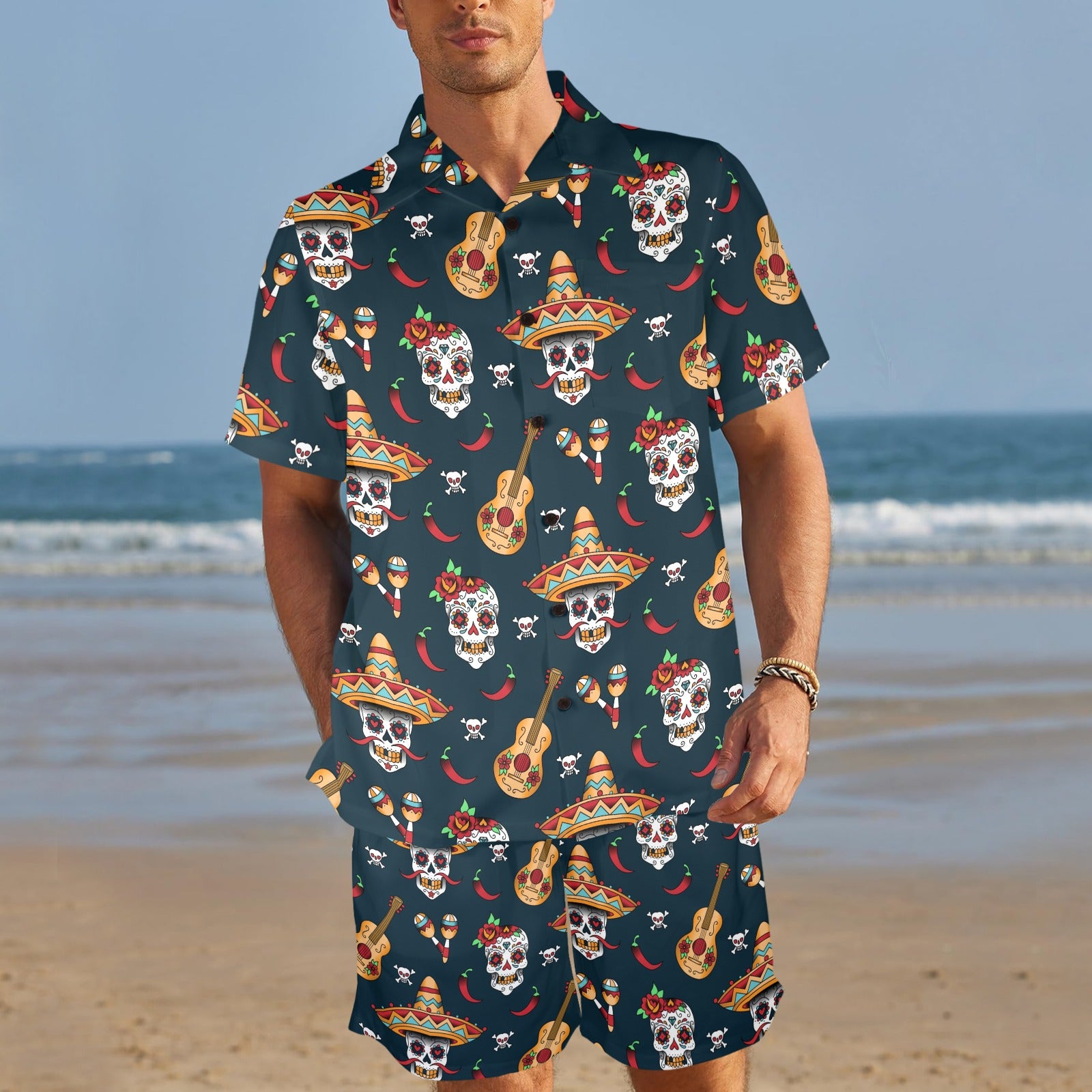 sugar skull Mexican Men's Beach Shirt and Shorts Set